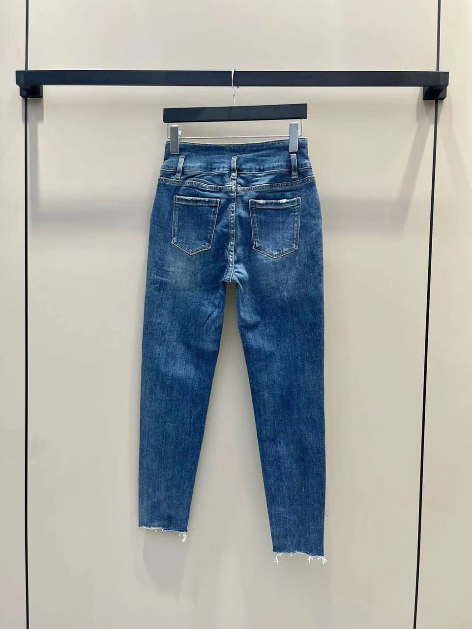 Джинсы Yves Saint Laurent LUX-94965 — это стильный предмет гардероба, сочетающий в себе классический крой и современный дизайн. Они выполнены в темно-синем цвете с потертостями, имеют прямой силуэт и высокую посадку, что визуально удлиняет ноги и подчеркивает талию.