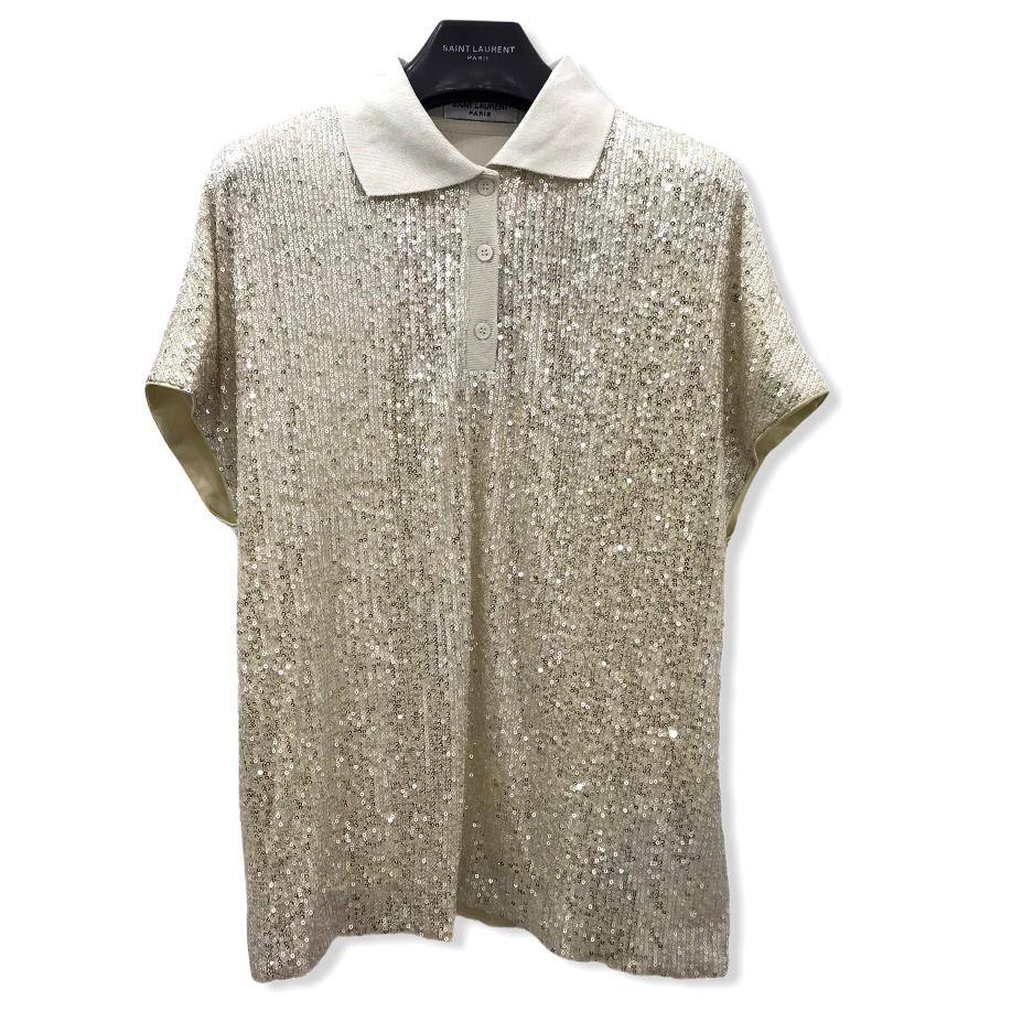 Футболка Yves Saint Laurent LUX-50370 представляет собой элегантную модель с отложным воротником и короткой планкой на пуговицах. Основной акцент в дизайне сделан на обильном покрытии изделия мелкими пайетками, создающими мерцающий эффект.