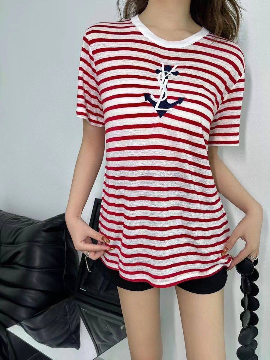 Футболка Yves Saint Laurent LUX-70017 выполнена в полосатом дизайне, сочетающем белый и красный цвета. Яркий акцент — вышивка в виде якоря с логотипом бренда. Футболка имеет круглый воротник и короткие рукава, что делает ее идеальной для повседневной носки.