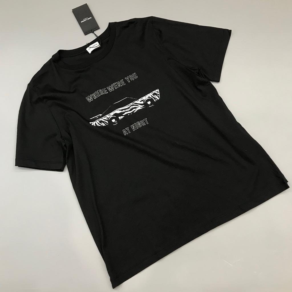Футболка Yves Saint Laurent LUX-44257 — это стильный выбор для тех, кто ценит оригинальность и комфорт. Черная футболка украшена уникальным принтом с изображением автомобиля и надписями "WHERE WERE YOU" и "AT NIGHT", что придает ей особый характер. Эта модель идеально подходит для создания непринужденных повседневных образов.