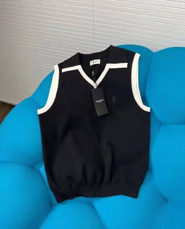 Стильная и элегантная кофта Yves Saint Laurent LUX-65814 выполнена в классическом черном цвете с контрастной белой отделкой по краю выреза и пройм. Лаконичный дизайн делает её универсальным элементом гардероба. Эта модель отлично подойдет как для создания повседневных образов, так и для более утонченных комбинаций.