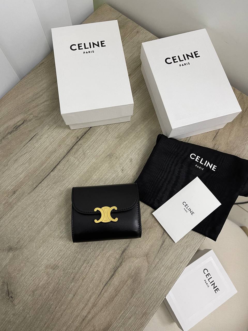Кошелек Celine LUX-80207, представленный на изображении, — это стильный аксессуар от известного бренда. Кошелек черного цвета, с минималистичным дизайном и характерной фурнитурой. Идеально подходит для хранения денег, карт и других мелких предметов.
