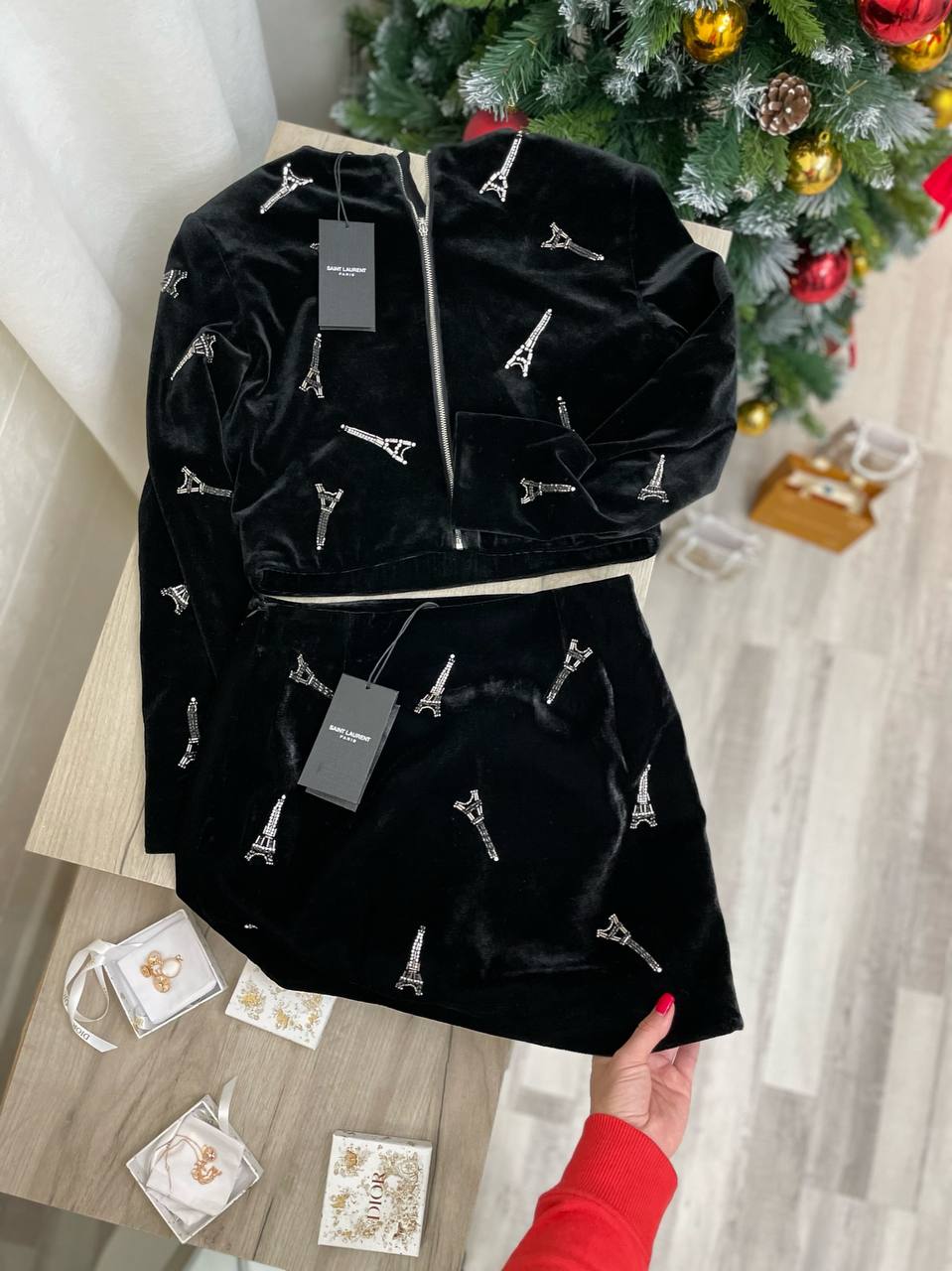 Костюм женский Yves Saint Laurent LUX-100147 – это изысканный комплект, состоящий из куртки и юбки, выполненный в элегантном стиле. Черный цвет, бархатная текстура и декоративные элементы в виде Эйфелевой башни делают этот костюм по-настоящему роскошным. Идеально подойдет для создания эффектного образа на вечерние мероприятия или для особых случаев.