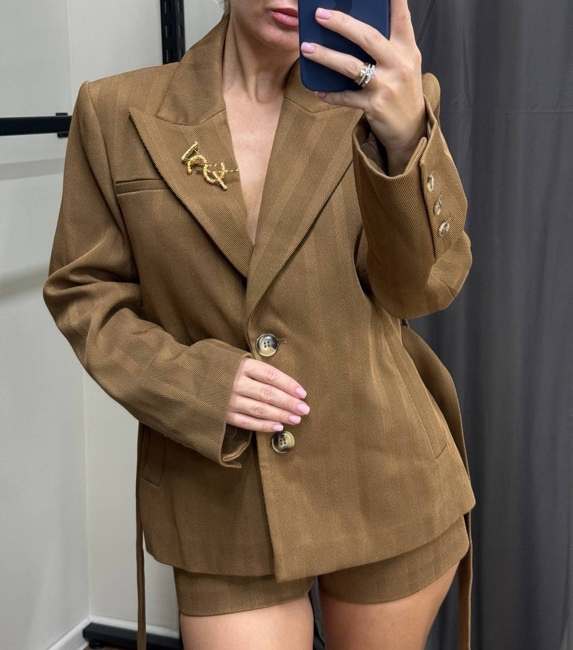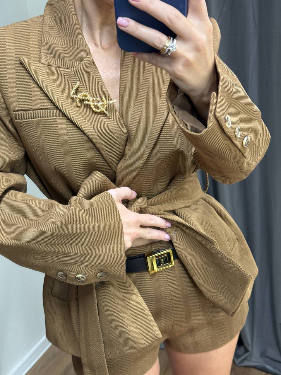 Костюм женский Yves Saint Laurent LUX-125054 - это стильный и современный комплект, состоящий из жакета с поясом и шорт. Идеальный выбор для создания модного образа.