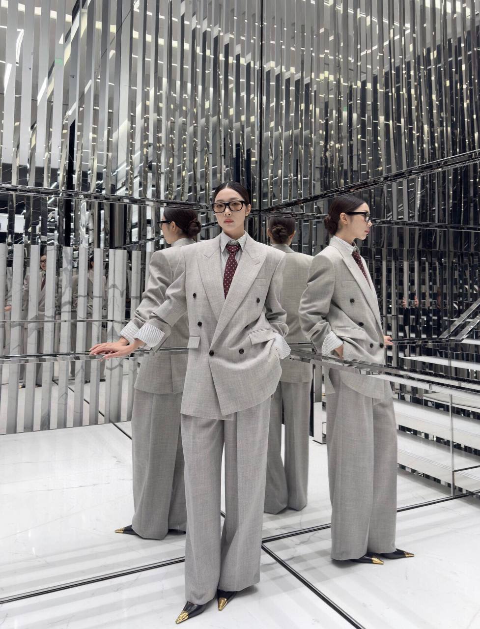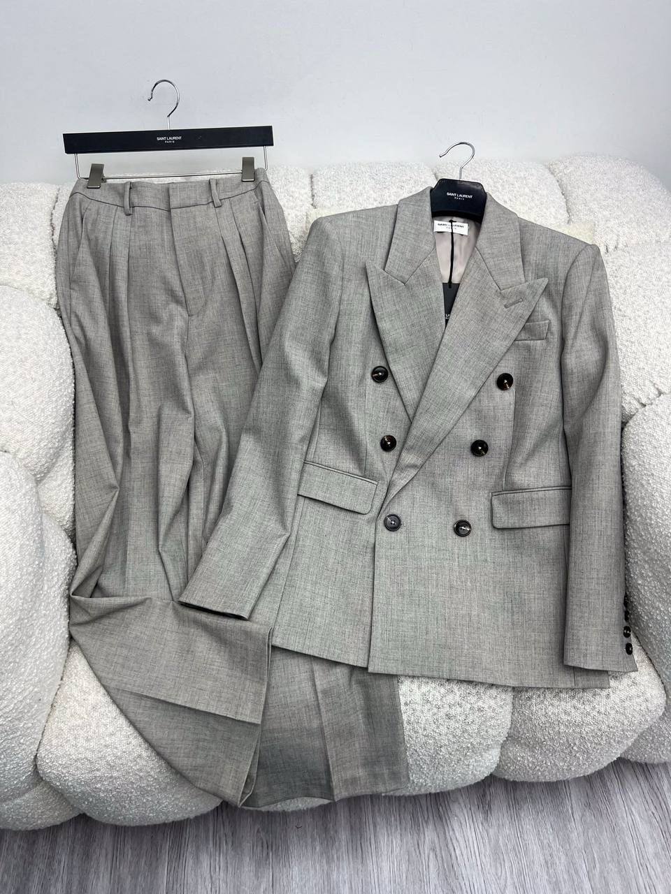 Костюм Yves Saint Laurent излучает элегантность и изысканность. Двубортный пиджак и широкие брюки создают современный и уверенный силуэт, идеально подходящий для деловых встреч или особых случаев.