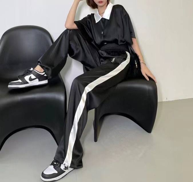 Этот женский костюм Yves Saint Laurent LUX-66609 выполнен в элегантном черном цвете, представляя собой сочетание классического стиля и современных трендов. Костюм включает в себя свободную блузу с отложным воротником и широкие брюки с контрастной белой полосой по бокам, что придает ему спортивный шик. Идеально подходит для создания эффектных повседневных и вечерних образов.