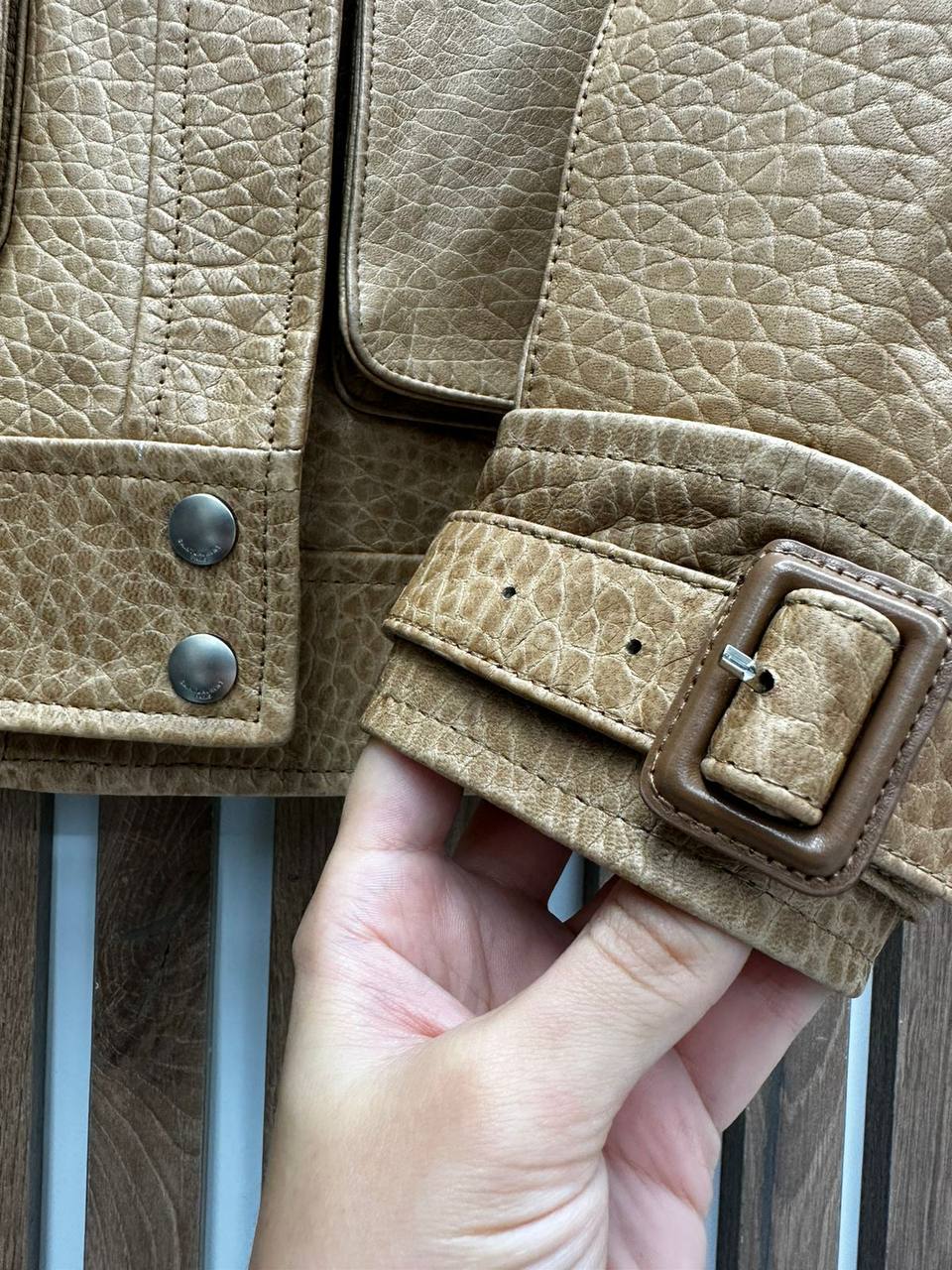 Кожаная куртка Yves Saint Laurent LUX-96222 – это воплощение элегантности и стиля. Куртка выполнена в классическом стиле с акцентом на текстуре кожи, представленной в светло-коричневом цвете. Этот предмет гардероба идеально подходит для создания как повседневных, так и более формальных образов.