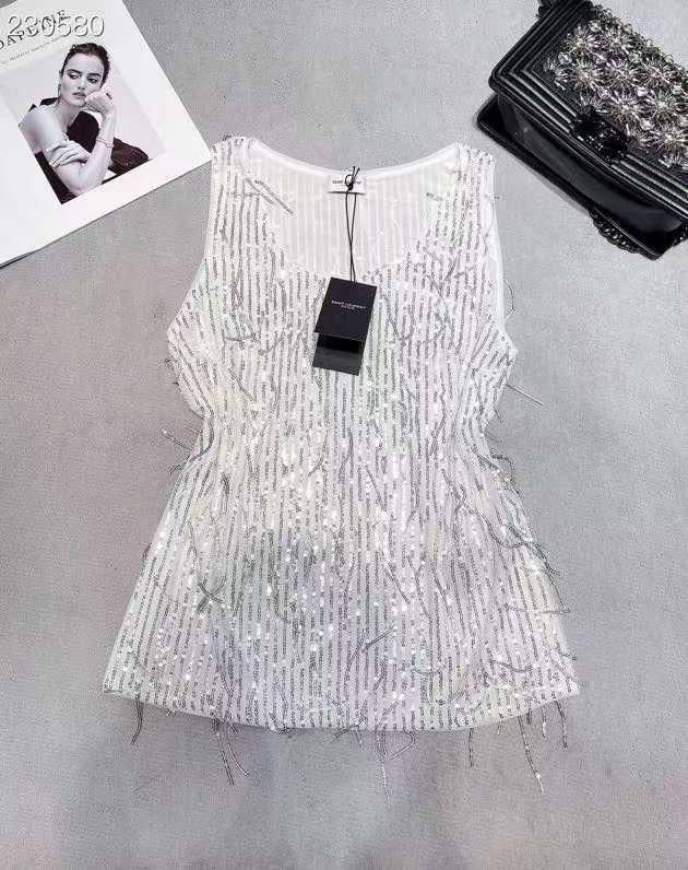 Yves Saint Laurent майка LUX-91494 - это элегантная майка, выполненная в блестящем стиле. Она выполнена в белом цвете с серебристыми элементами, создающими эффектный блеск. Подчеркните свой неповторимый стиль с этой изысканной майкой.