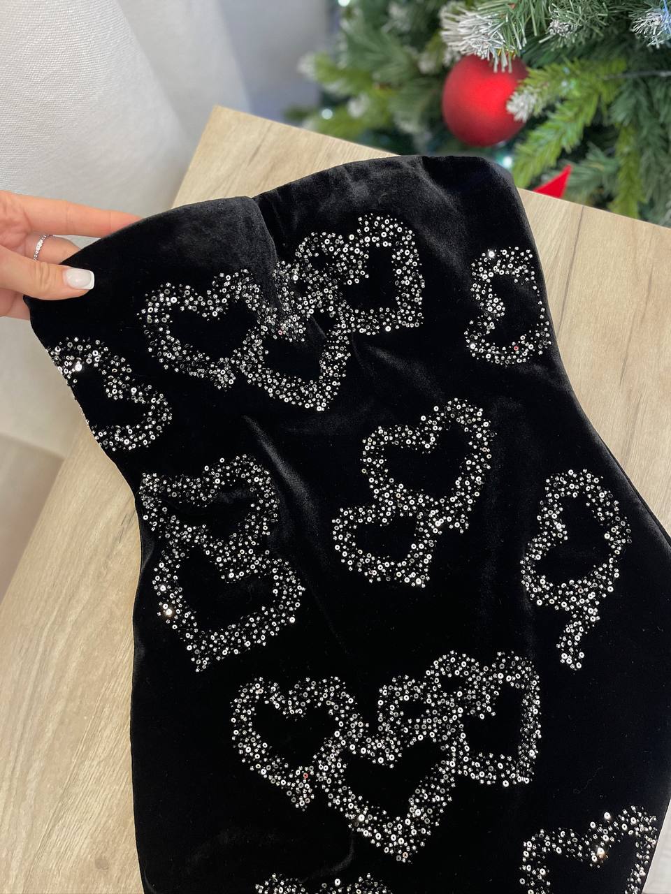 Платье Yves Saint Laurent LUX-100148 — это воплощение изысканности и стиля. Чёрное мини-платье без бретелек украшено сверкающими элементами в форме сердец, добавляя образу нотку романтики и праздника. Отделка из перьев по нижнему краю придает ему легкость и делает его идеальным выбором для вечерних мероприятий.