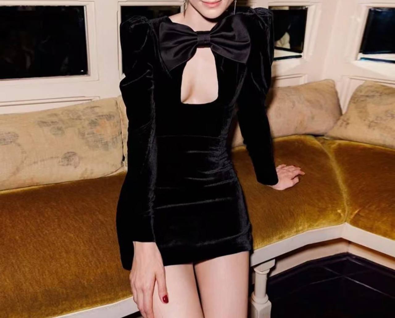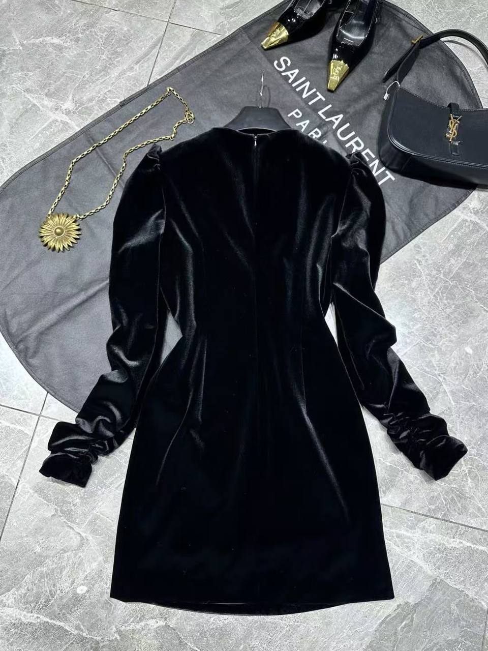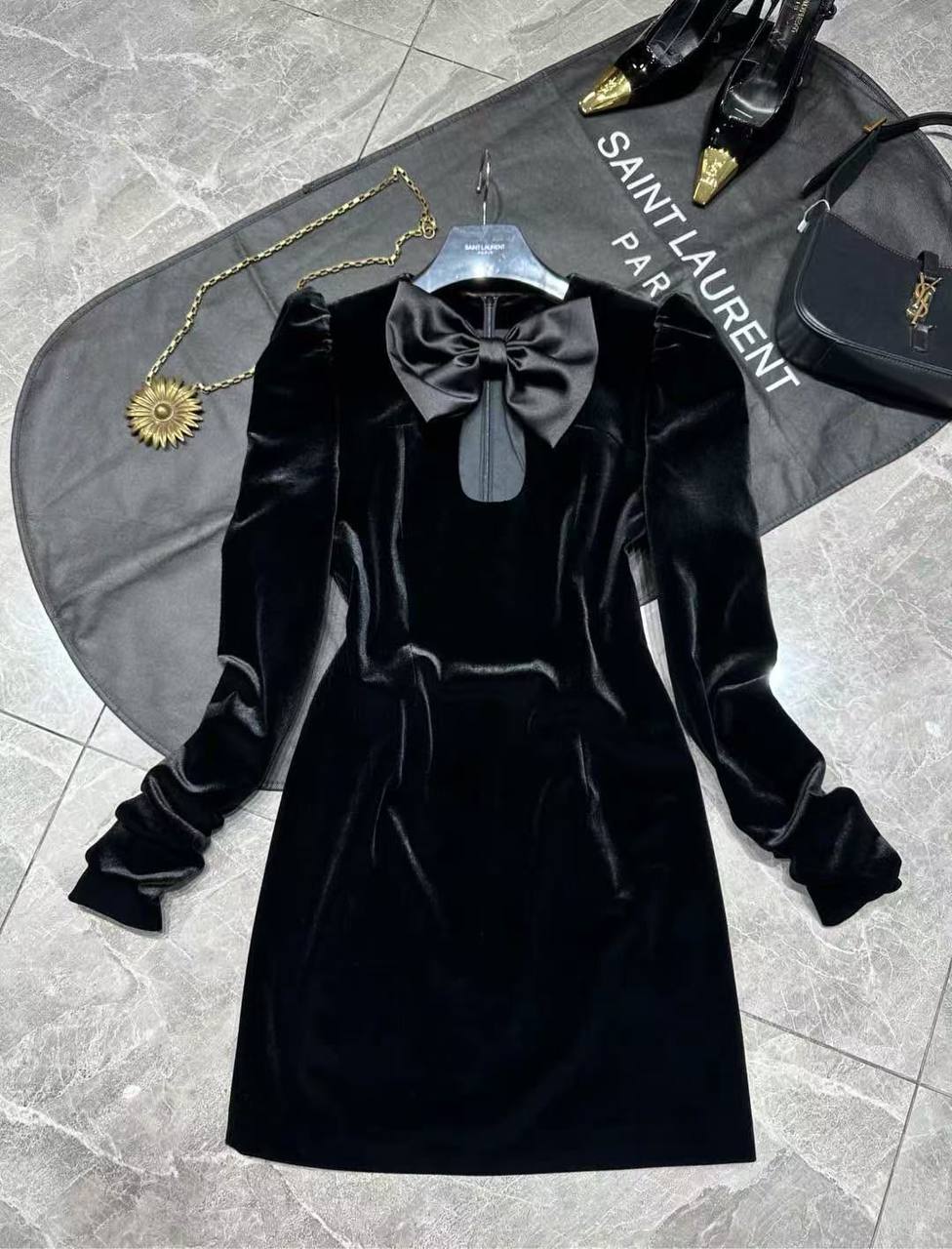 Платье Yves Saint Laurent LUX-114002 - это воплощение роскоши и элегантности. Черное бархатное платье с длинными рукавами, акцентированным бантом на груди и вырезом. Идеально подходит для вечерних выходов и особых случаев.
