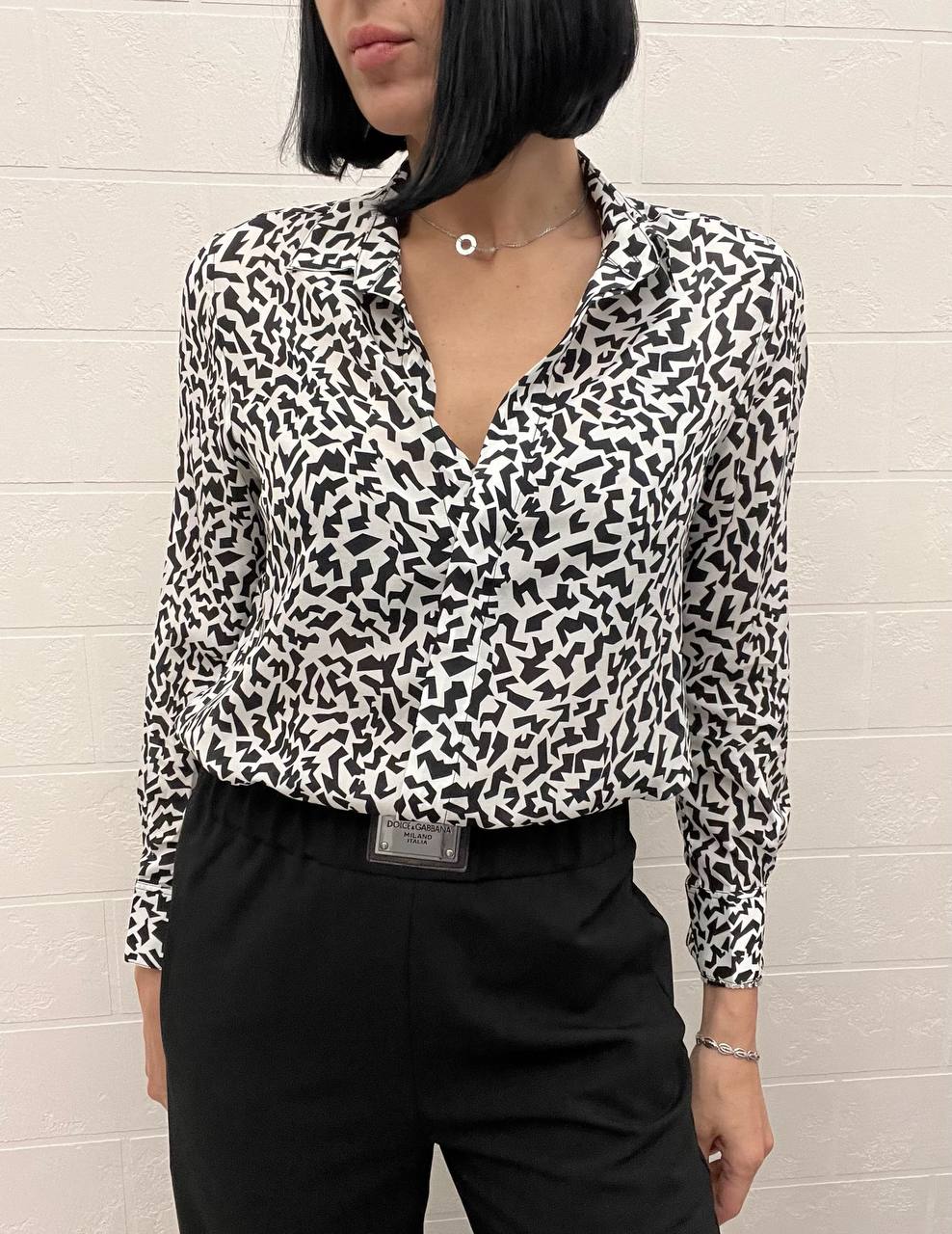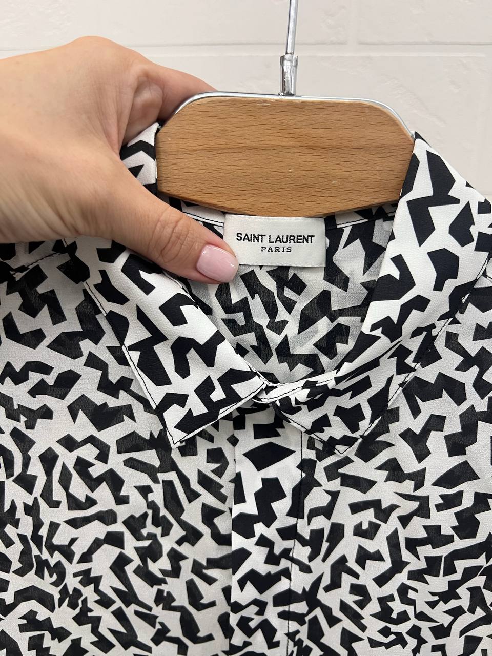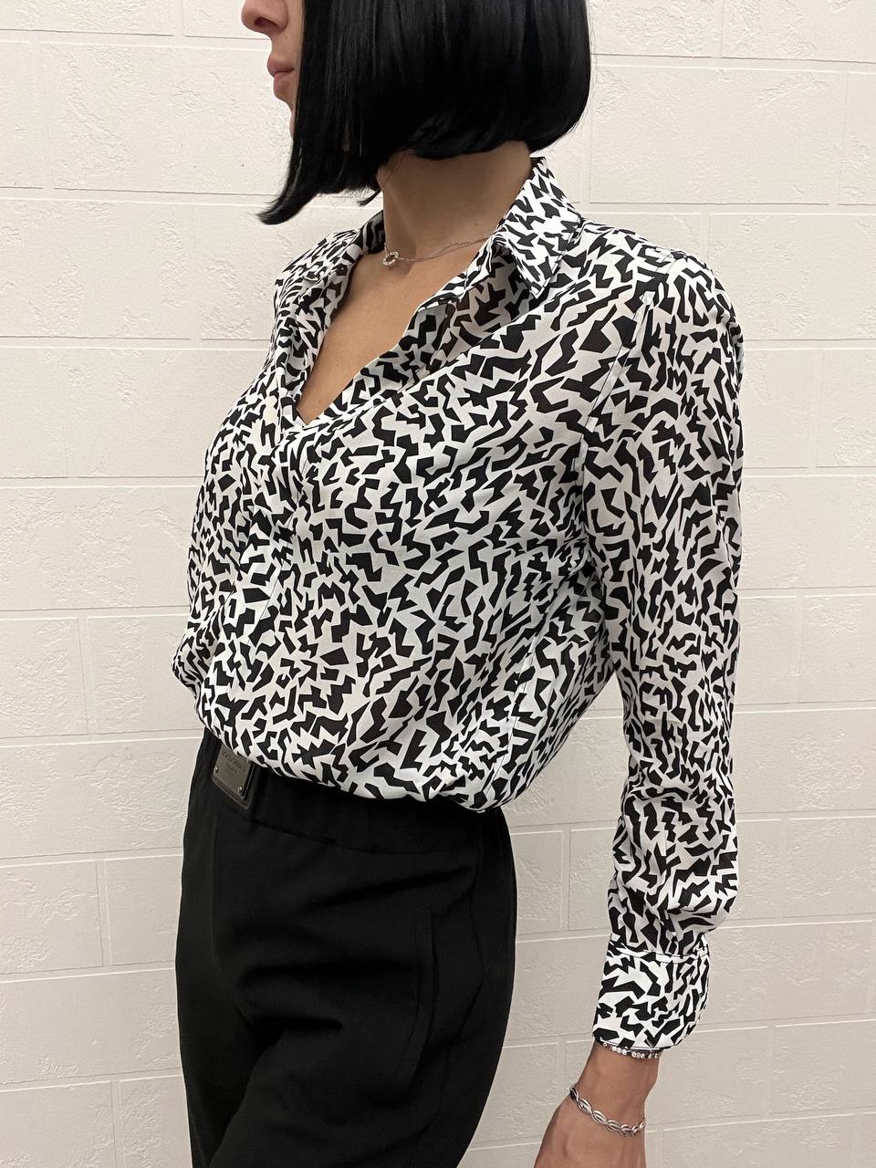 Рубашка Yves Saint Laurent LUX-109332 представляет собой элегантную модель с длинными рукавами, выполненную в черно-белой цветовой гамме с абстрактным принтом. Этот элемент гардероба сочетает в себе изысканность и современный стиль, идеально подходя для различных образов.