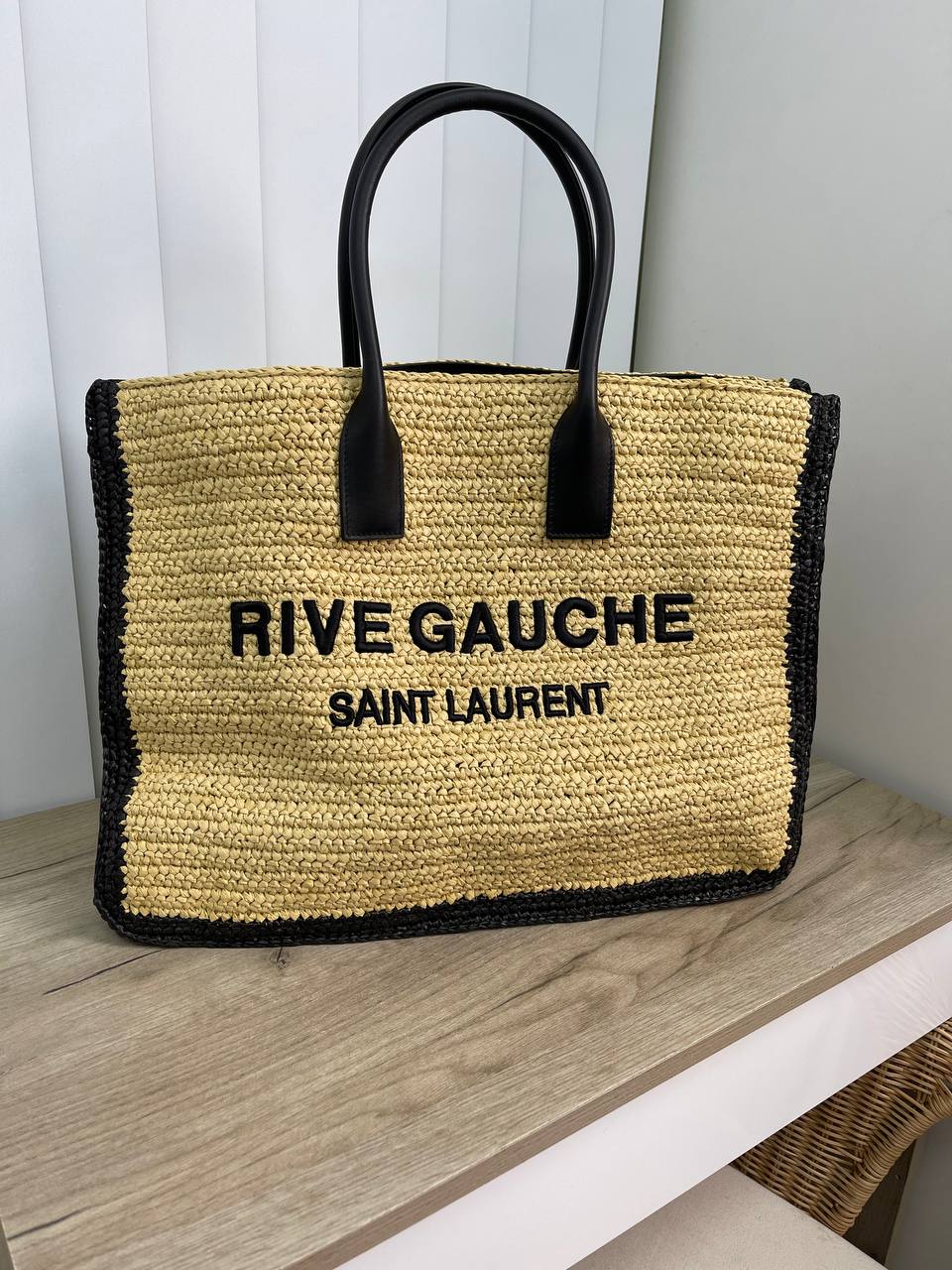 Сумка женская Yves Saint Laurent LUX-70828 представляет собой стильную сумку-шоппер, выполненную в светлых тонах с черными элементами. Сумка имеет прямоугольную форму и декорирована надписью "RIVE GAUCHE SAINT LAURENT". Эта сумка идеально подойдет для повседневного использования и подчеркнет ваш стиль.