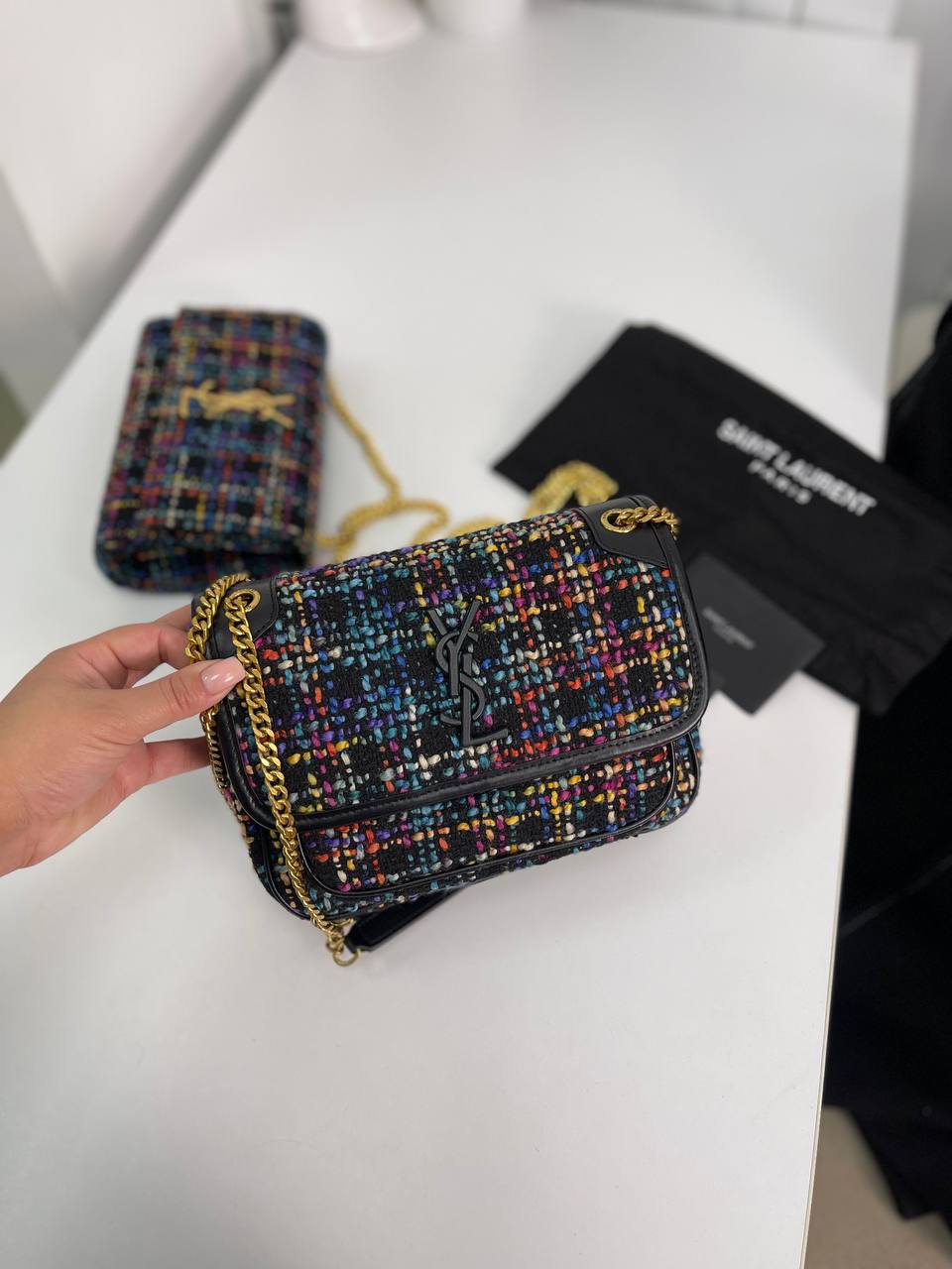 Сумка женская Yves Saint Laurent LUX-81129 — это элегантная сумка через плечо, выполненная в классическом стиле. Она имеет яркий разноцветный твидовый узор, который придает ей неповторимый вид, а также золотую цепочку через плечо. Эта сумка идеально подходит для повседневной носки и особых случаев, подчеркивая индивидуальность своей обладательницы.