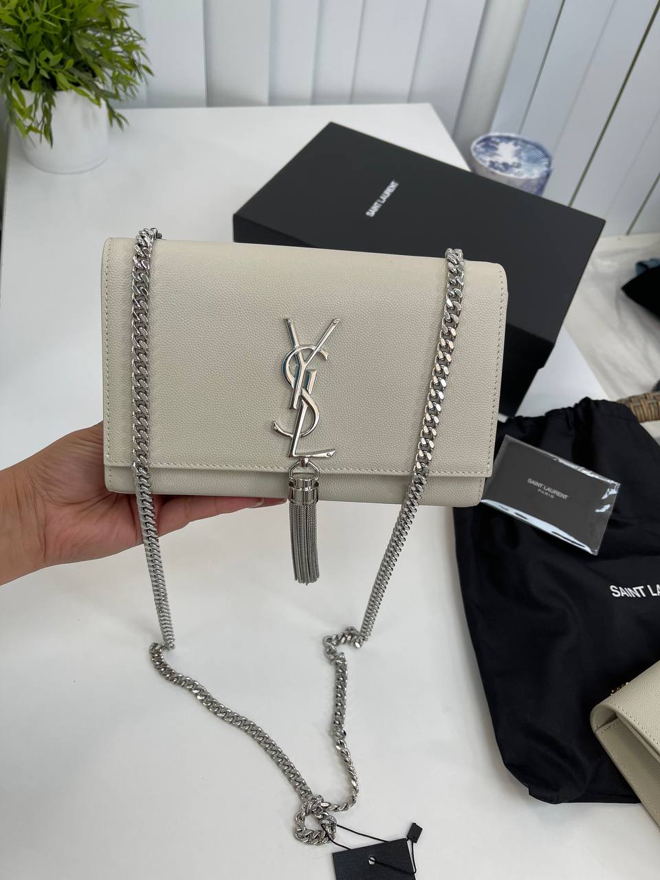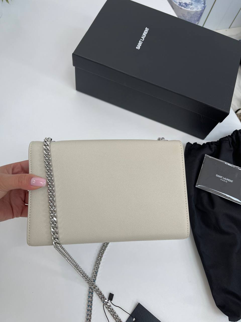Сумка женская Yves Saint Laurent LUX-93569 выполнена в классическом стиле. Она выполнена в светлом цвете с серебристой фурнитурой и цепочкой. Эта сумка идеально дополнит как повседневный, так и вечерний образ.