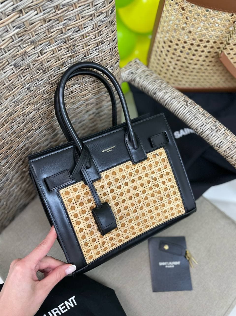 Изысканная женская сумка Yves Saint Laurent LUX-64049 сочетает в себе классический дизайн и современные материалы. Эта модель среднего размера идеально подходит для создания элегантных образов на каждый день или для особых случаев. Сочетание гладкой кожи и фактурной вставки из ротанга придает ей уникальный шарм и узнаваемость.