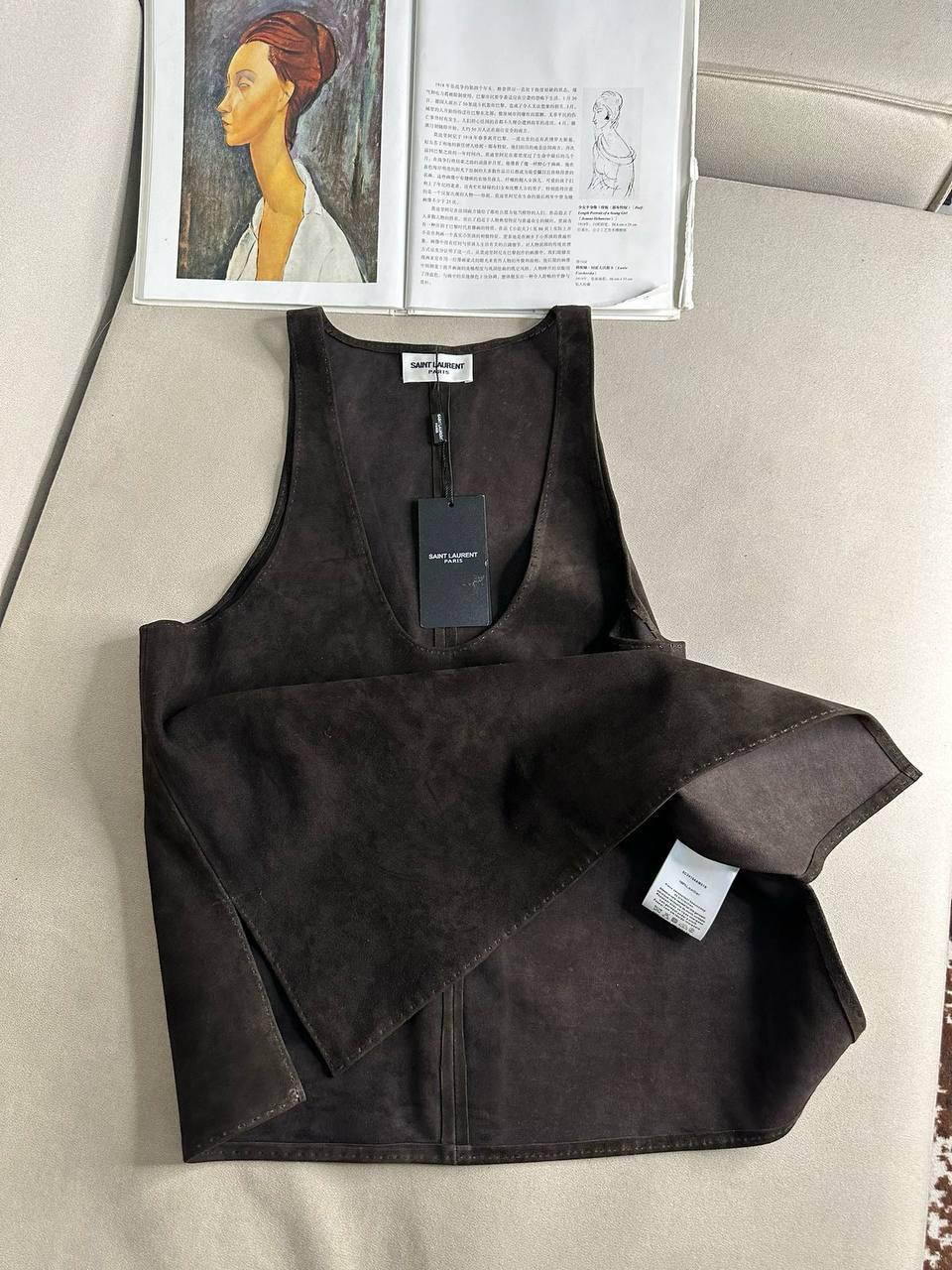 Топ Yves Saint Laurent LUX-110778 — это стильный предмет гардероба. Данный топ, выполненный в тёмно-коричневом цвете, имеет текстуру, напоминающую замшу, и V-образный вырез. Подходит для создания элегантных и современных образов.