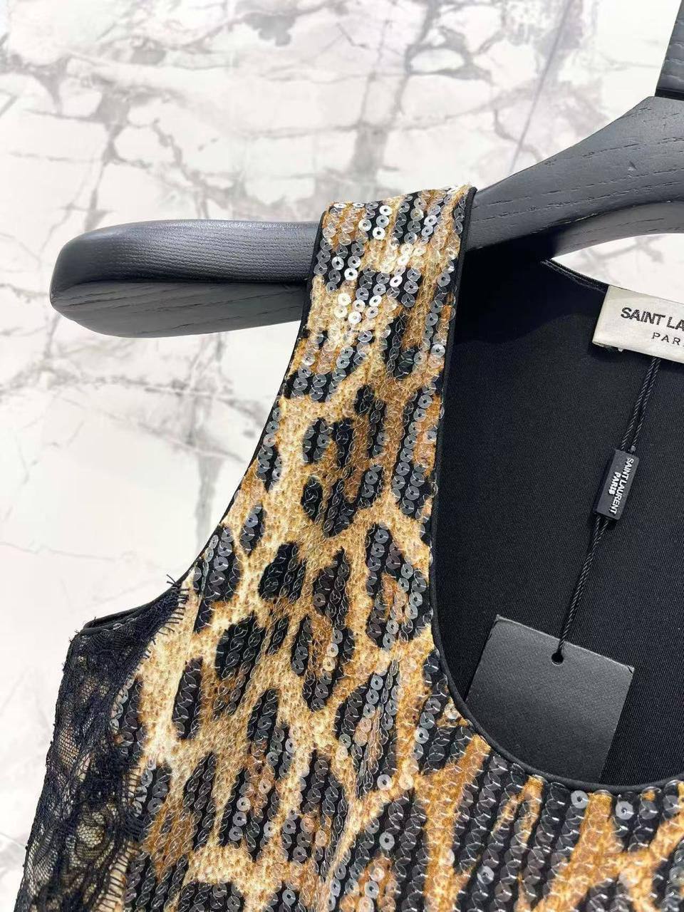 Топ Yves Saint Laurent LUX-112788 представляет собой роскошный предмет гардероба. Топ выполнен в стиле гламур, сочетает в себе леопардовый принт с блестками и черное кружево. Идеально подойдет для создания эффектного образа.