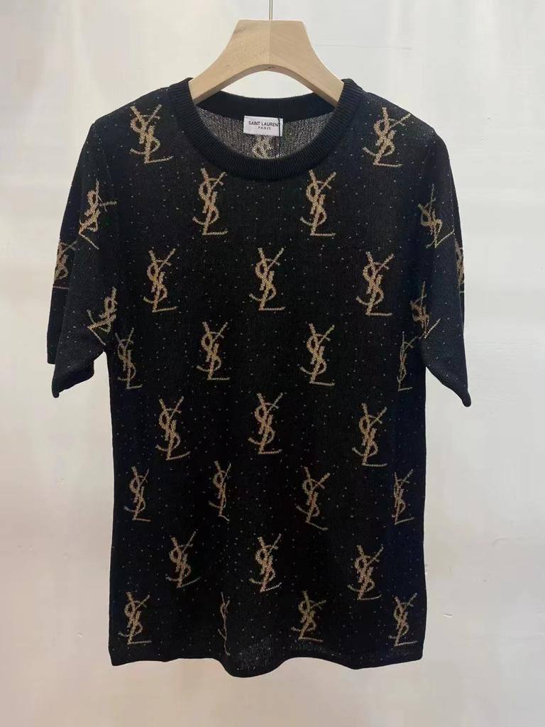 Трикотажная футболка Yves Saint Laurent LUX-91488 выполнена в узнаваемом стиле бренда. Черный цвет изделия гармонично сочетается с золотистым принтом. Эта футболка идеально подойдет для создания как повседневных, так и более элегантных образов.