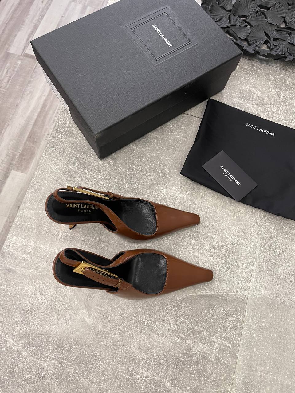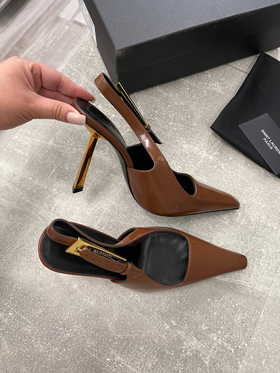 Туфли Yves Saint Laurent LUX-99643 - это элегантные туфли-лодочки с заостренным носком и открытой пяткой. Туфли выполнены в коричневом цвете, с акцентом на золотистый каблук и пряжку. Идеальный выбор для создания утонченного и стильного образа.