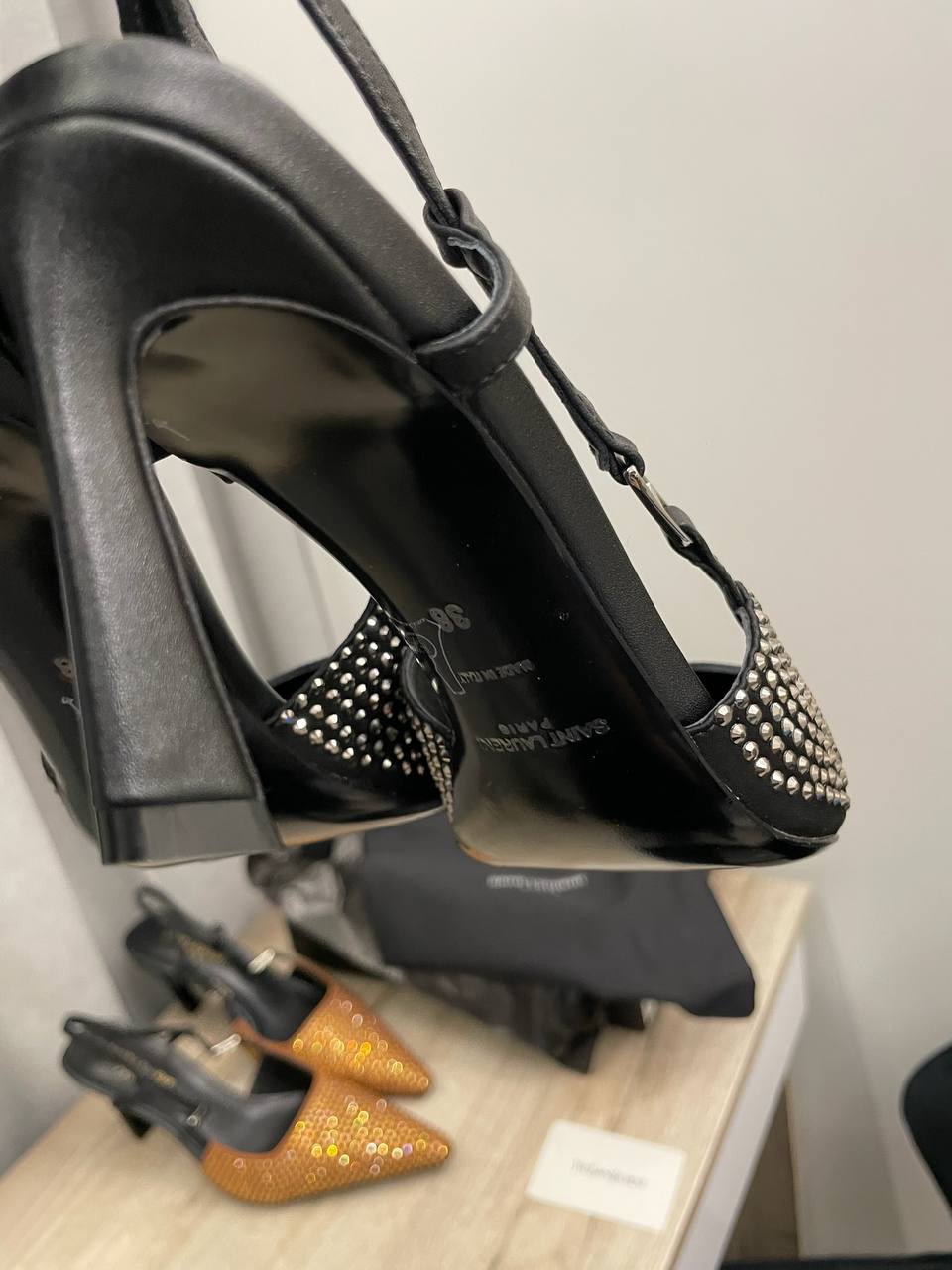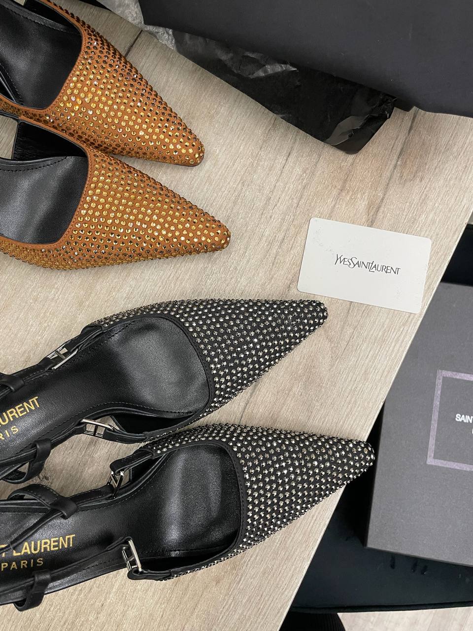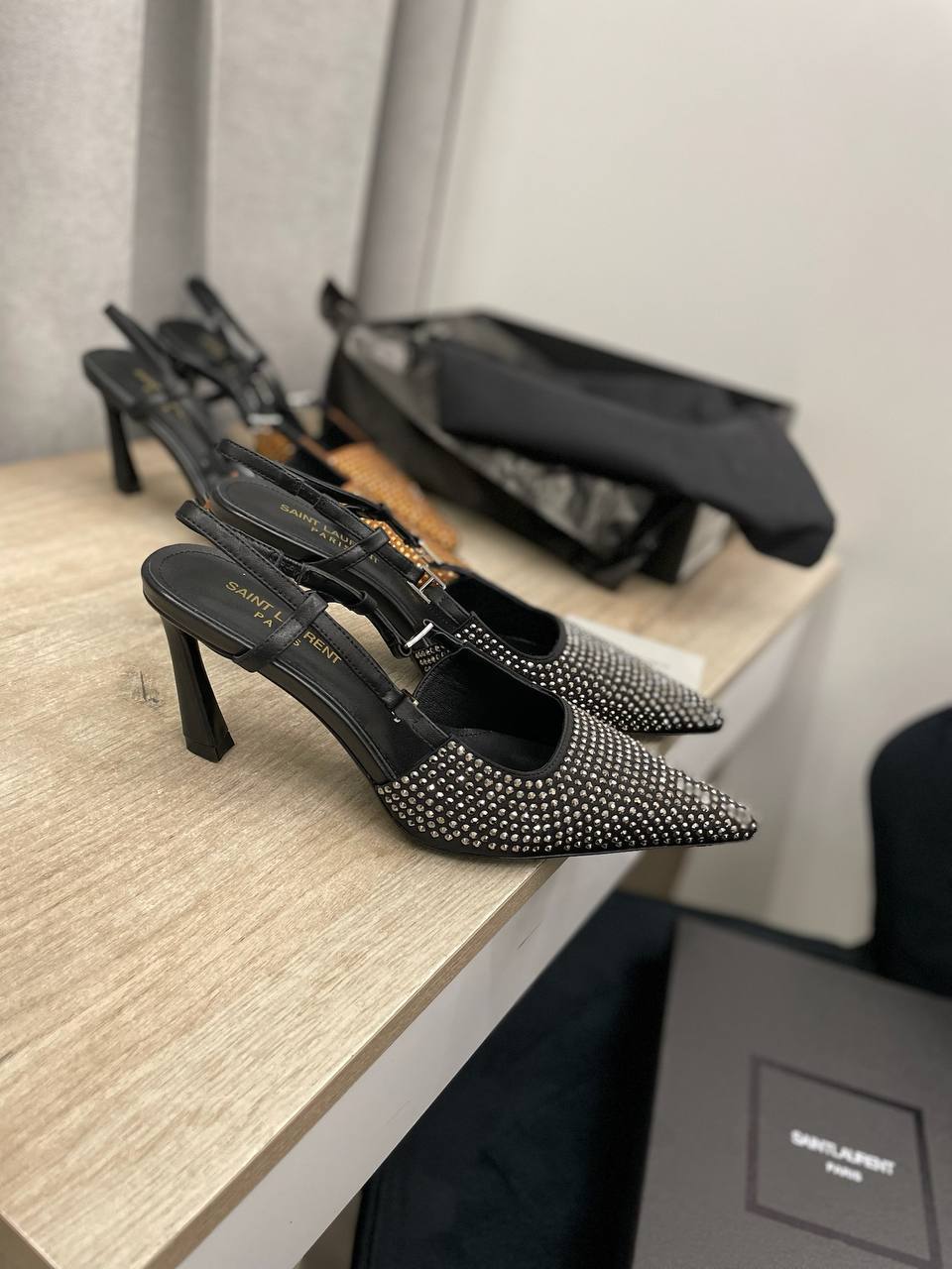 Туфли Yves Saint Laurent LUX-114856 представляют собой элегантные туфли-слингбэки с острым носком, декорированные металлическими элементами. Черный цвет и блестящие детали придают им изысканный и современный вид. Идеальны для вечерних выходов или торжественных мероприятий.