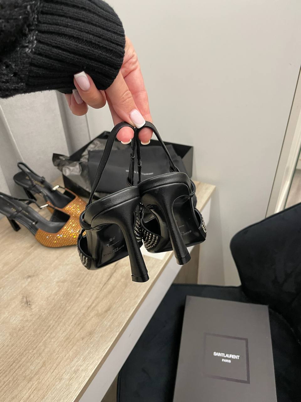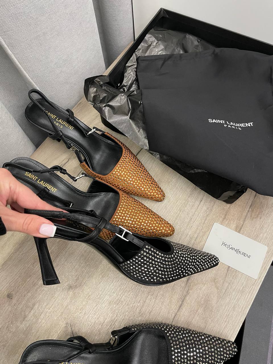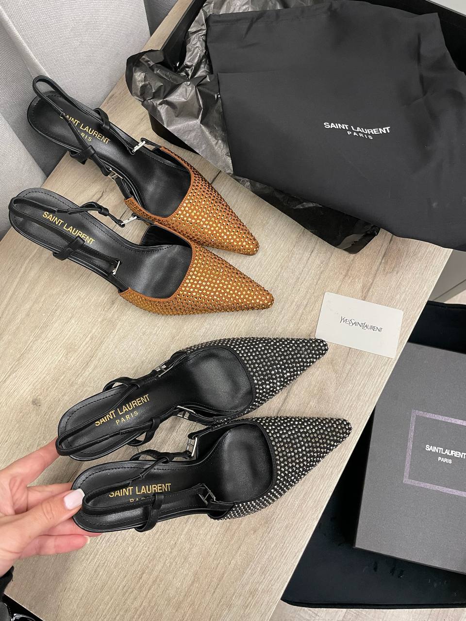Туфли Yves Saint Laurent LUX-114856 представляют собой элегантные туфли-слингбэки с острым носком, декорированные металлическими элементами. Черный цвет и блестящие детали придают им изысканный и современный вид. Идеальны для вечерних выходов или торжественных мероприятий.