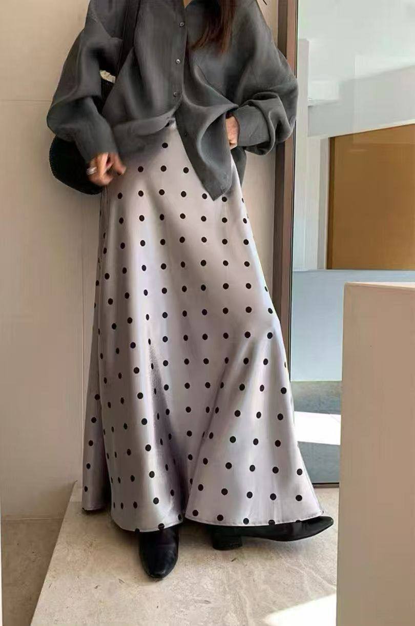 Юбка Yves Saint Laurent LUX-117277 представляет собой элегантный предмет гардероба в романтичном стиле. Юбка макси, выполненная в сером цвете, украшена черным горошком. Она идеально подходит для создания женственных и стильных образов.