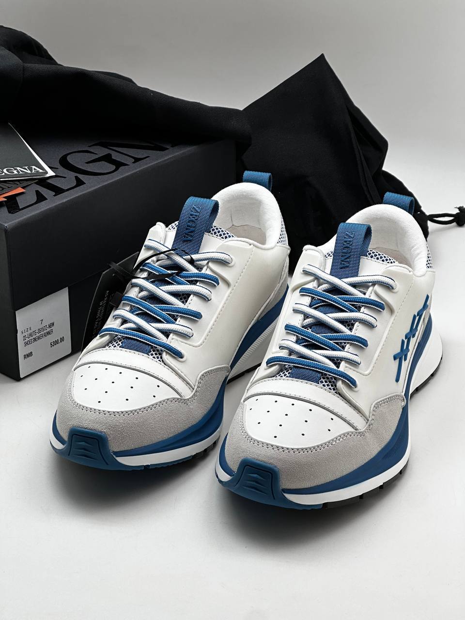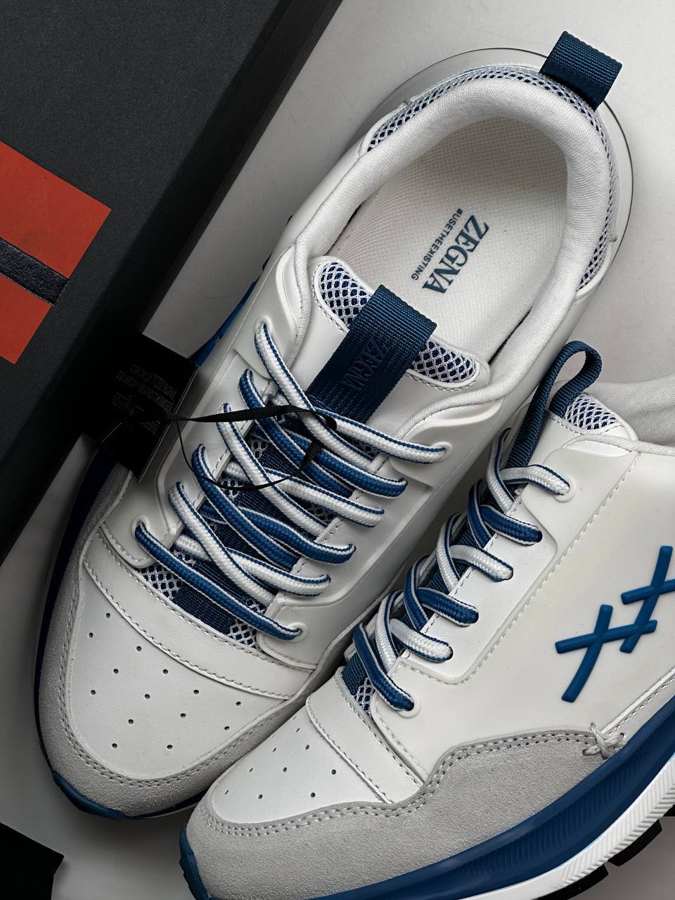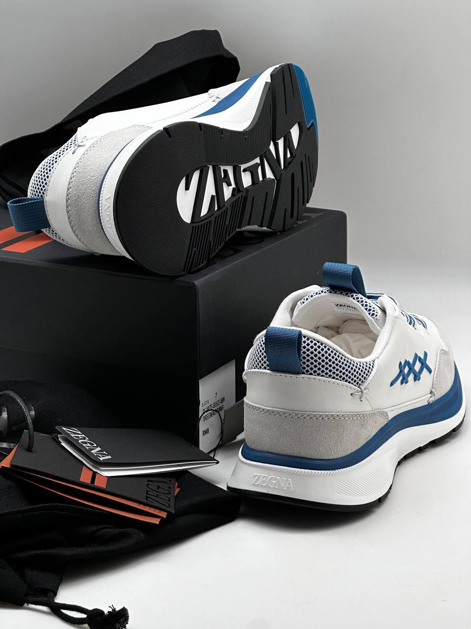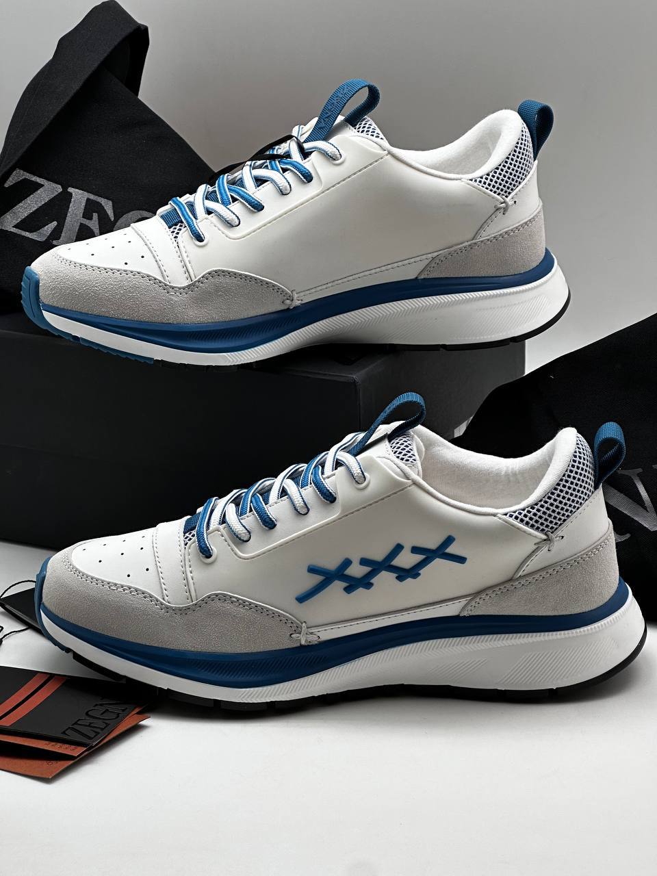 Кроссовки ZEGNA LUX-89438 - это стильные кроссовки в белом цвете с элементами синего и серого. Они выполнены в современном спортивном стиле и подойдут для повседневной носки, подчеркивая индивидуальность и вкус.