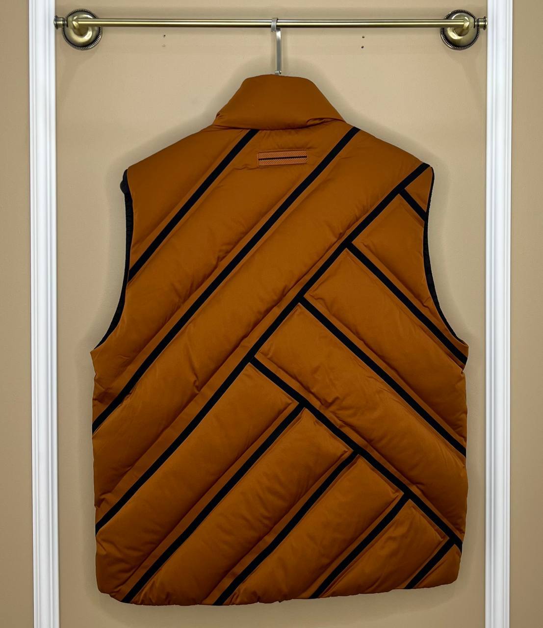 Жилет ZEGNA LUX-98885 - это стильный мужской жилет, выполненный в современном дизайне. Оранжевый цвет изделия дополнен черными контрастными линиями, создавая эффектный геометрический узор. Этот жилет станет отличным дополнением к повседневному или спортивному образу, обеспечивая комфорт и тепло.