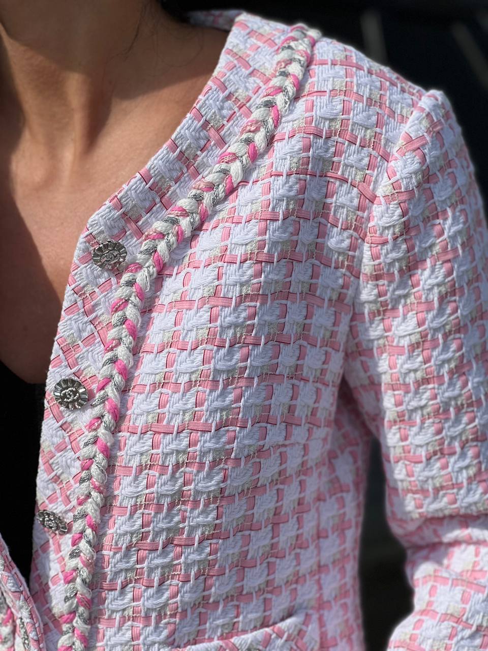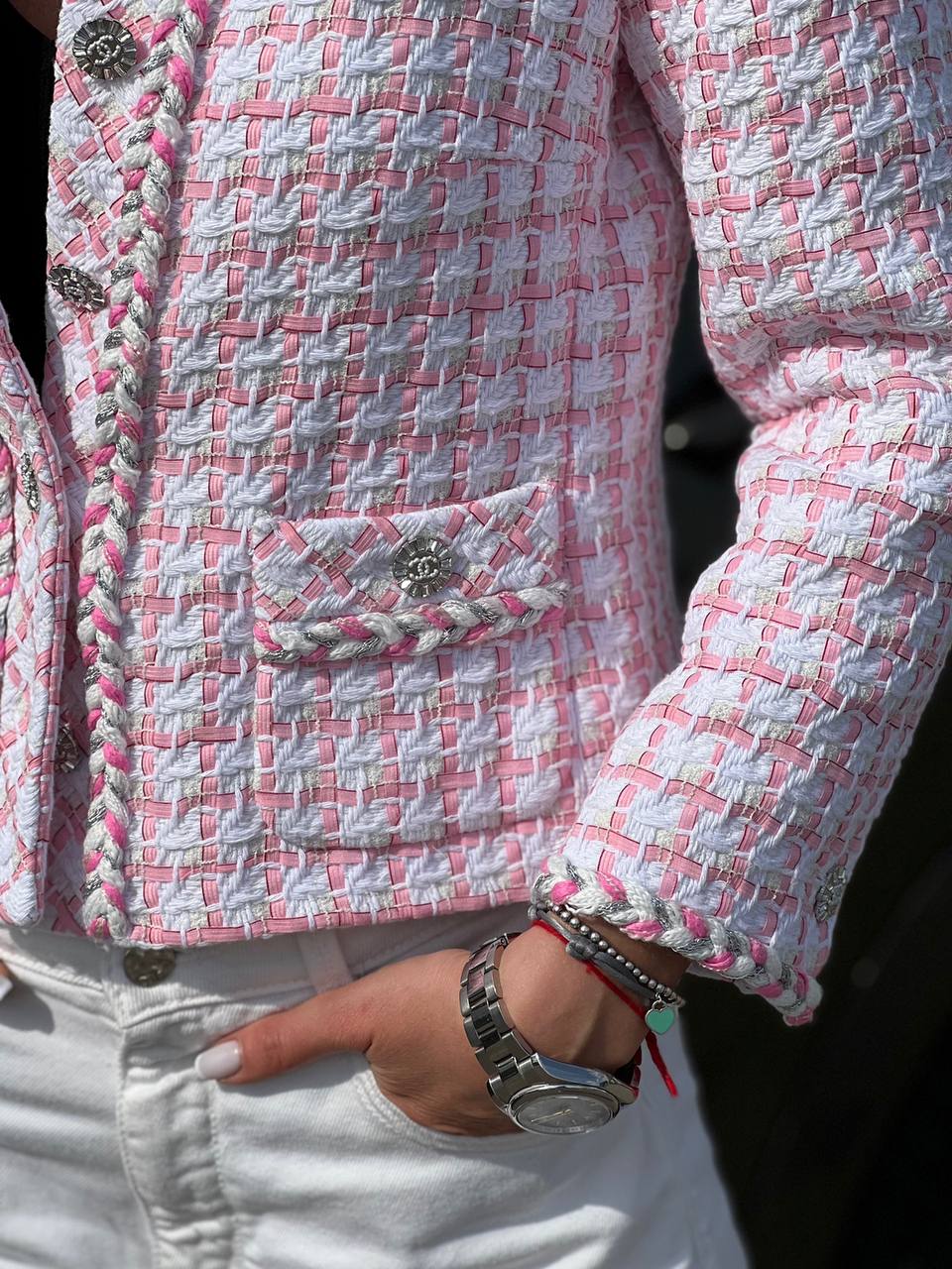 Жакет Chanel LUX-89951 — это элегантный предмет гардероба, который воплощает в себе стиль и изысканность. Жакет выполнен в нежных бело-розовых тонах, с аккуратной текстурой, придающей изделию шарм. Он идеально подходит для создания утонченных образов.