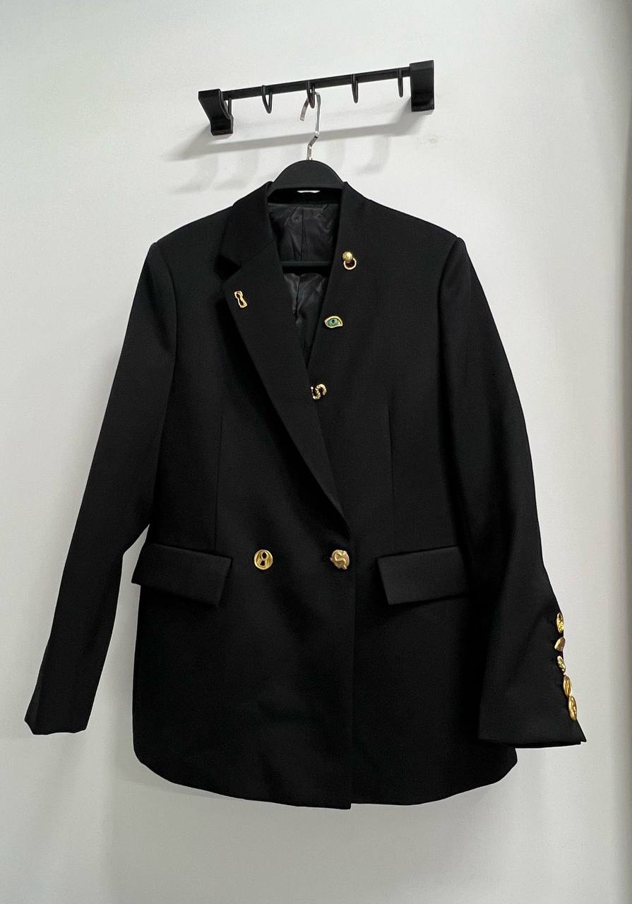 Жакет LUX-117427 – это стильный жакет классического кроя. Он выполнен в черном цвете, имеет гладкую текстуру и дополнен золотистой фурнитурой. Жакет отлично подойдет для создания элегантных образов в различных ситуациях.