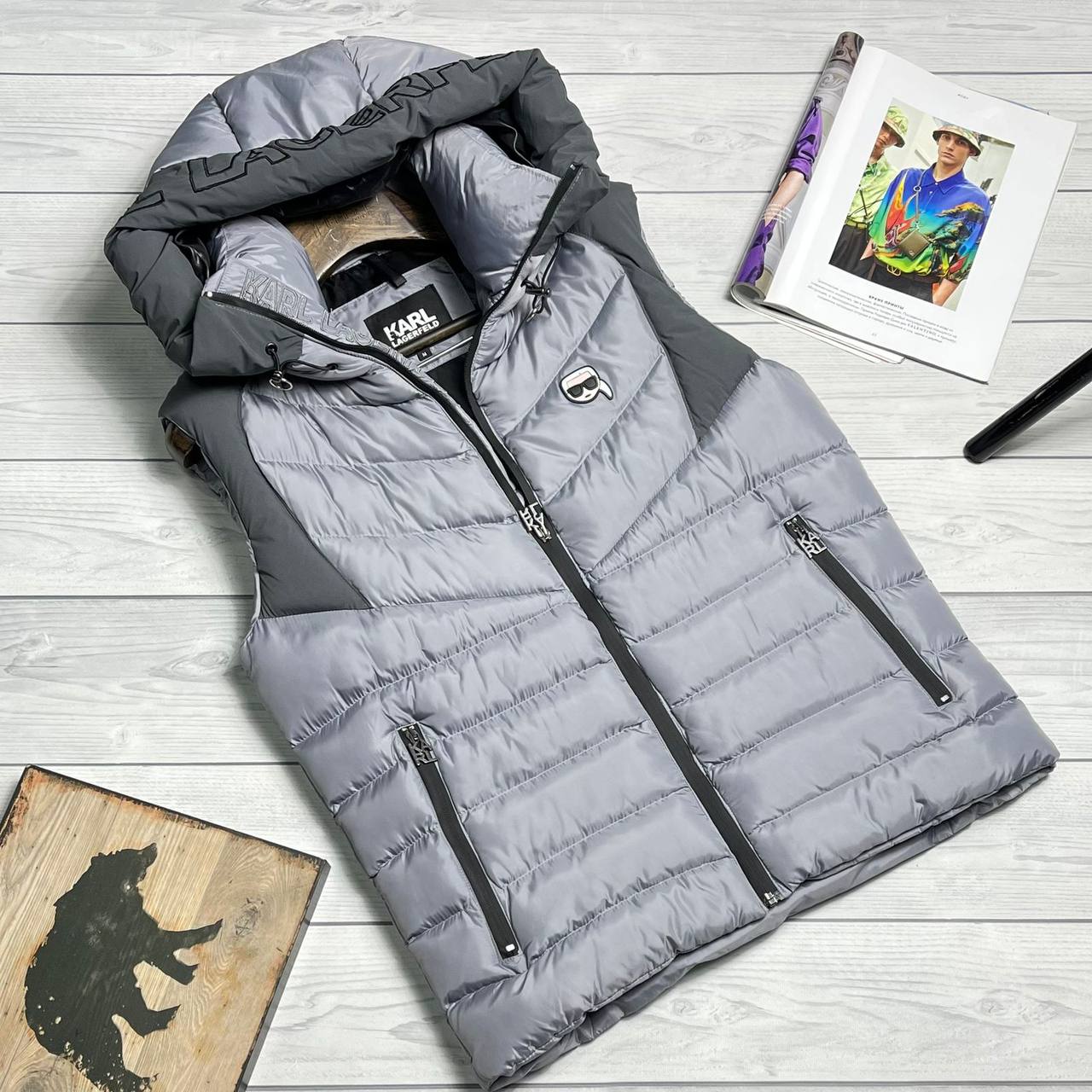 Жилет Karl Lagerfeld LUX-76637 — стильная и современная модель для повседневной носки. Жилет выполнен в сером цвете с контрастными темно-серыми вставками, имеет стеганую структуру и оснащен капюшоном. Отлично подойдет для создания модных образов в демисезонный период.
