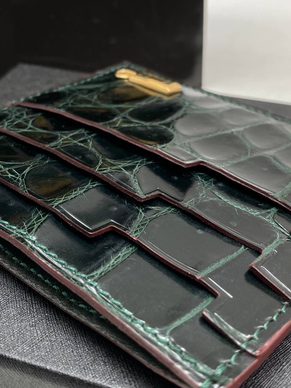 Картхолдер из редкой кожи каймана Zilli LUX-115447 представляет собой стильный аксессуар, выполненный в классическом стиле. Темно-зеленый цвет и текстура кожи каймана придают изделию элегантный и эксклюзивный вид. Картхолдер предназначен для хранения банковских карт и визиток, подчеркивая статус владельца.