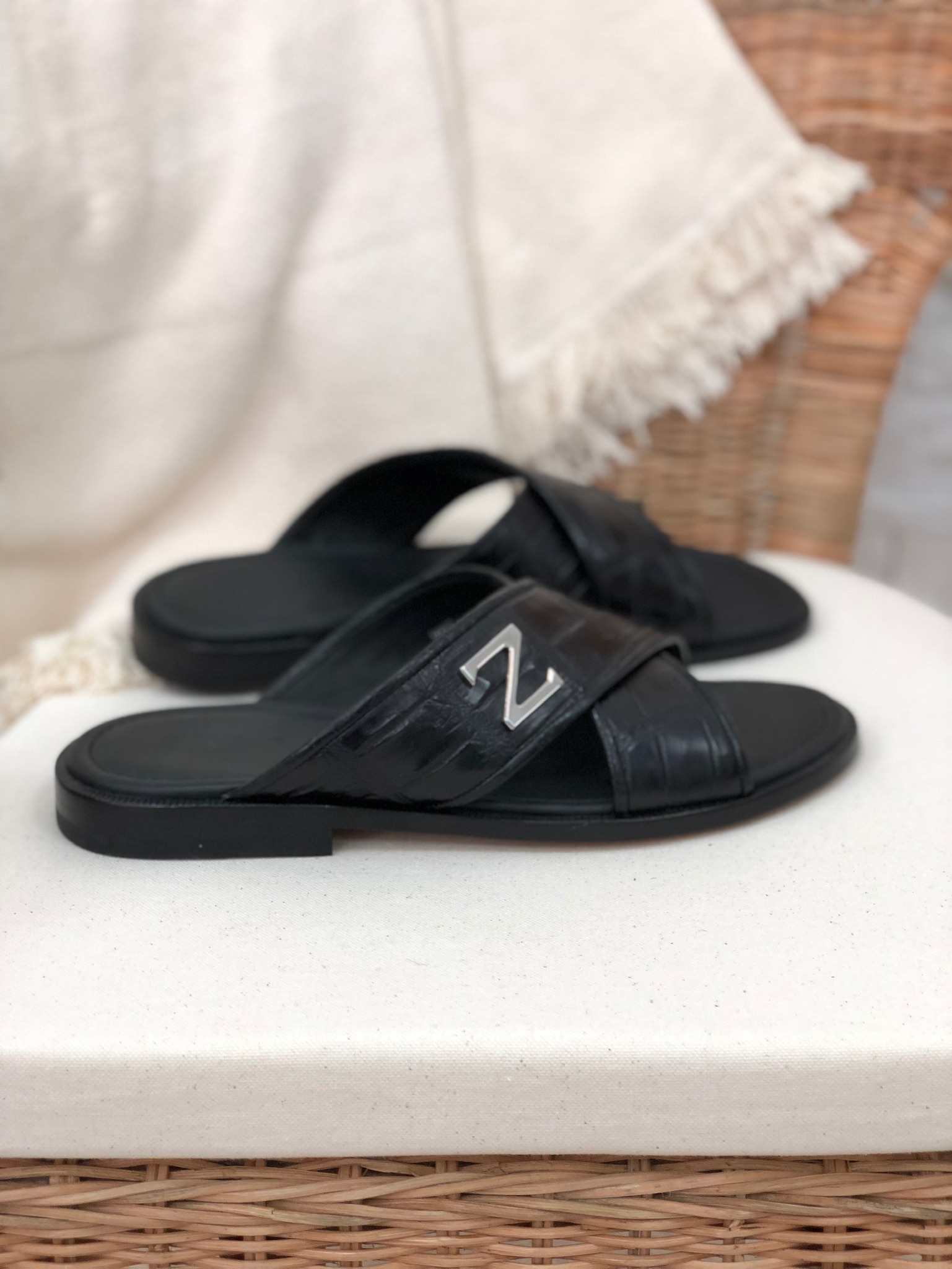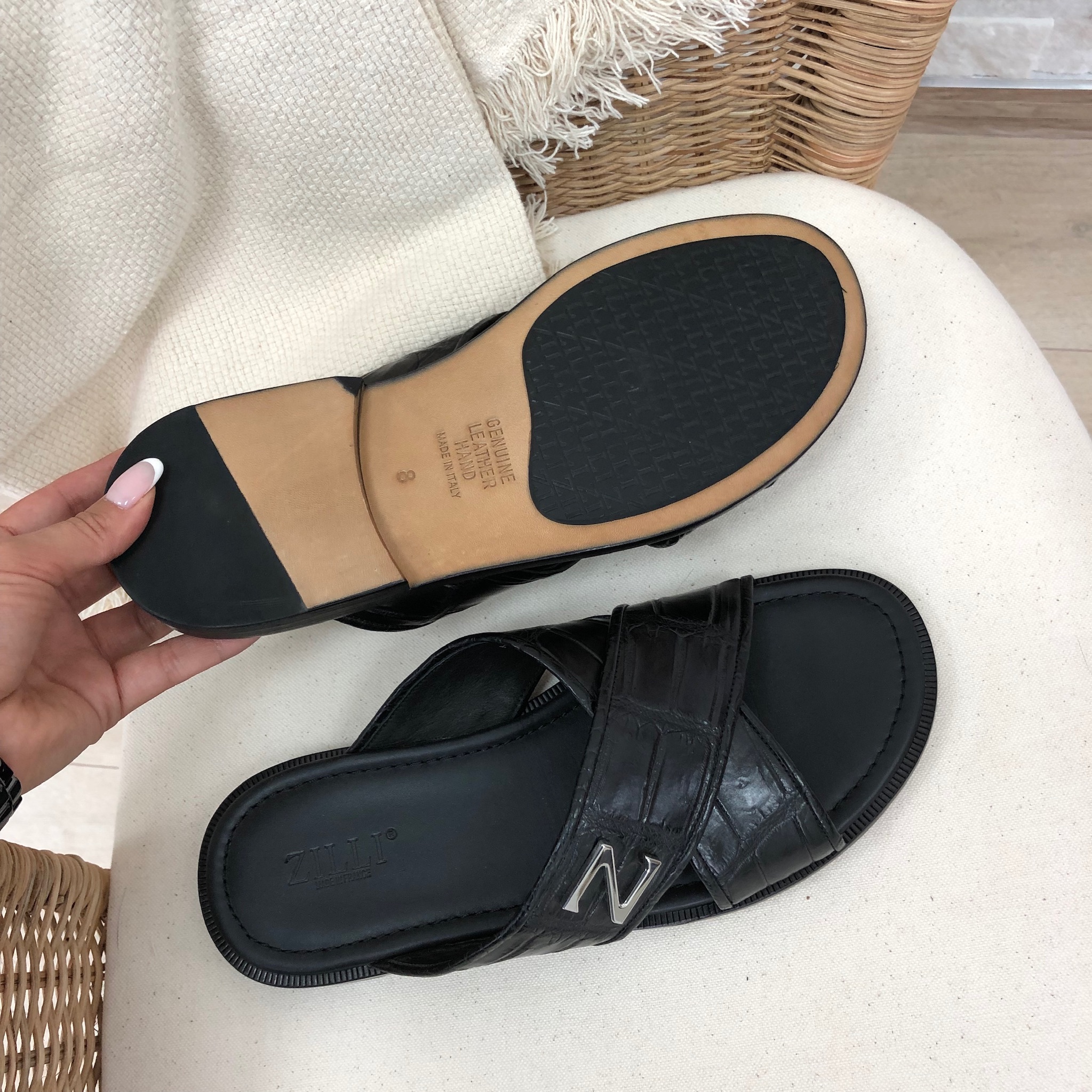 Шлёпанцы мужские Zilli LUX-14819 – это стильное и элегантное решение для теплого времени года. Модель выполнена в классическом черном цвете с фактурой под кожу рептилии, что придает ей особый шарм. Перекрещивающиеся ремешки с металлическим декором в виде буквы "Z" обеспечивают надежную фиксацию и добавляют изысканности. Эти шлёпанцы идеально подойдут для создания непринужденных, но в то же время утонченных образов.