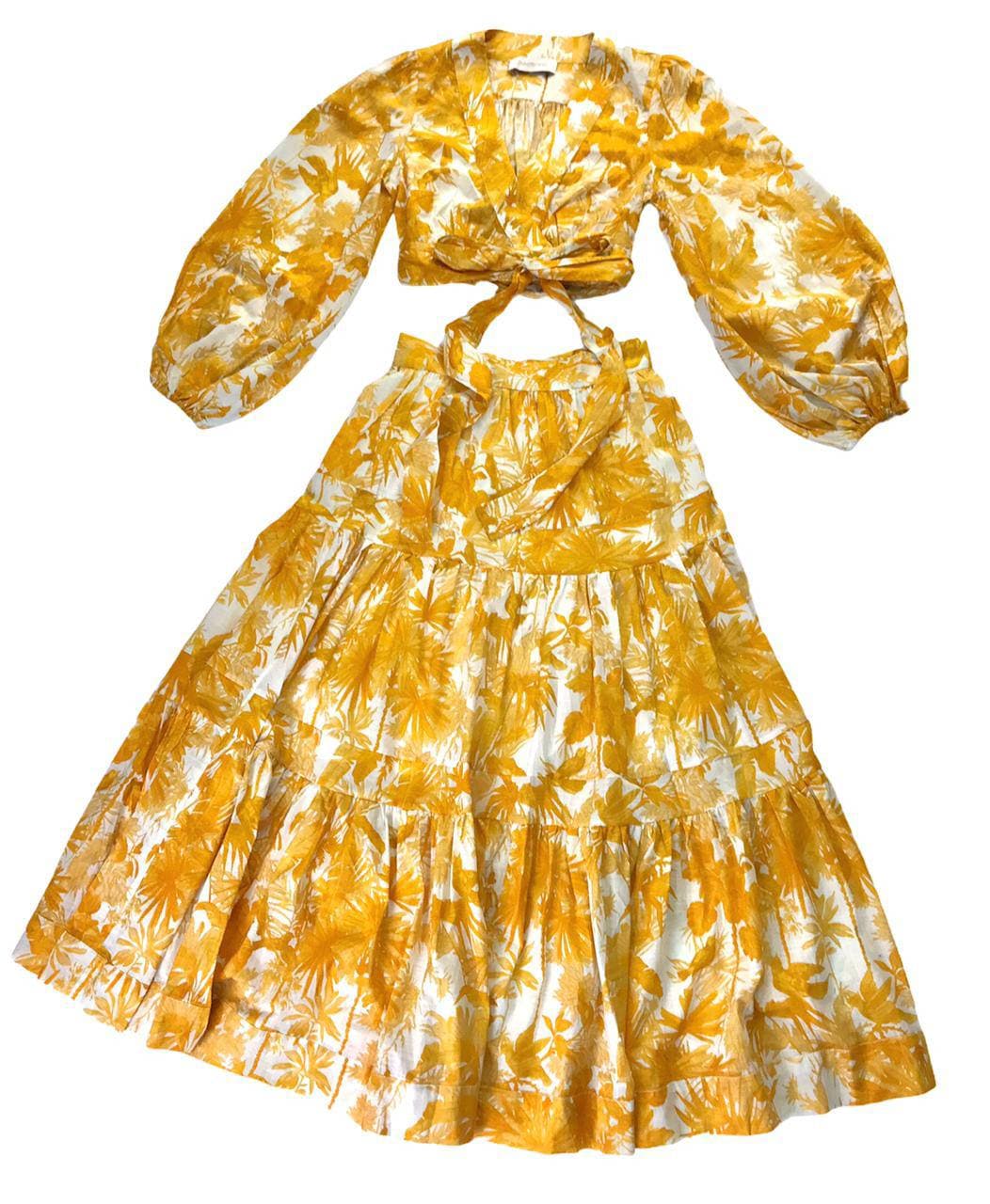 Zimmermann Костюм женский LUX-54095 – это изысканный ансамбль, состоящий из укороченного топа с объемными рукавами и длинной многоярусной юбки. Яркий цветочный принт в желто-белых тонах создает летнее настроение и делает образ незабываемым. Идеальный выбор для создания стильных повседневных и праздничных образов.