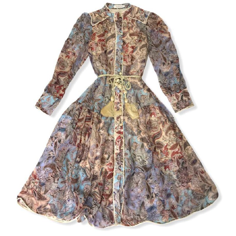 Платье Zimmermann LUX-52096 – это женственное и изящное платье макси, выполненное в стиле бохо-шик. Его многослойный цветочный принт, напоминающий акварельные разводы, придает образу легкость и воздушность. Платье с длинными рукавами и воротником-стойкой, украшенное декоративными кисточками на поясе, идеально подойдет для летних прогулок, свиданий или торжественных мероприятий.