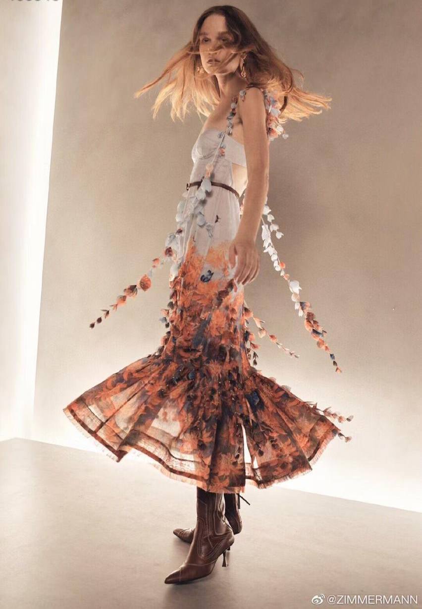 Платье Zimmermann LUX-52496 — это изысканное длинное платье с ярким цветочным принтом, вдохновленным природой. Модель выполнена в стиле бохо-шик, с акцентом на струящийся силуэт и оригинальный декор из лепестков, напоминающих крылья бабочек или осенние листья. Это платье идеально подходит для торжественных мероприятий, летних вечеринок или фотосессий, создавая легкий и романтичный образ.