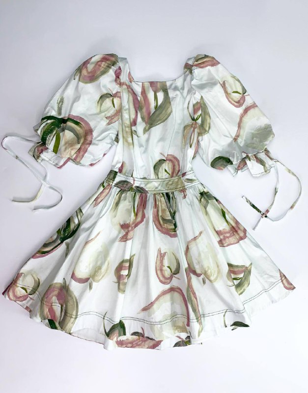 Платье Zimmermann LUX-52879 – это женственное летнее платье в стиле бохо. Легкая модель с пышными рукавами-фонариками и квадратным вырезом горловины украшена нежным акварельным принтом. Принт представляет собой стилизованные изображения фруктов или цветов в розовых, зеленых и бежевых тонах на белом фоне. Юбка платья расклешенная, создает романтичный силуэт.