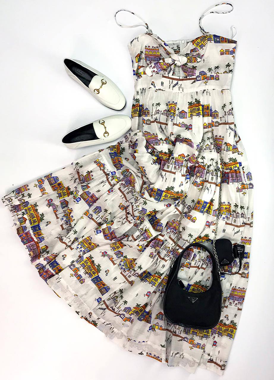 Платье Zimmermann LUX-53411 – это легкое летнее платье с ярким принтом, выполненное в стиле бохо. Модель с тонкими бретелями и акцентом на талии, украшенное узелком спереди, идеально подходит для создания непринужденных и женственных образов. Оригинальный рисунок, изображающий живописные домики и пальмы, придает платью особый шарм и напоминает о беззаботном отдыхе.