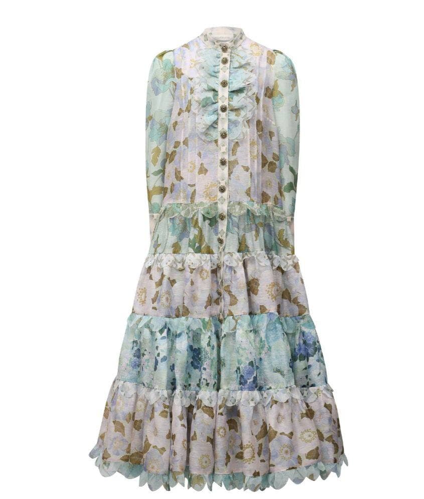 Платье Zimmermann LUX-60796 — это элегантное творение в винтажном стиле, выполненное в нежной пастельной цветовой гамме с изысканным цветочным принтом. Модель с длинными рукавами, высоким воротником-стойкой и оборками на груди придает образу утонченность и романтичность. Многоярусная юбка с оборками создает объем и женственный силуэт.