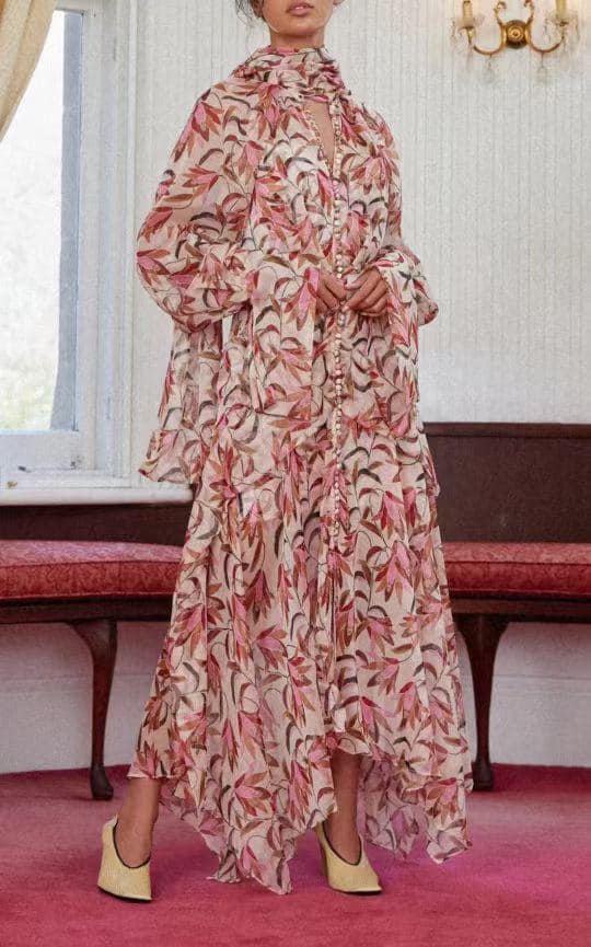 Представляем вам элегантное платье Zimmermann LUX-47713, выполненное в романтичном стиле с живописным цветочным принтом. Легкая ткань и многослойный крой создают воздушный силуэт, идеально подходящий для особых случаев или летних мероприятий. Привлекательный дизайн с высоким воротником-стойкой и длинными объемными рукавами придает образу утонченность и женственность.