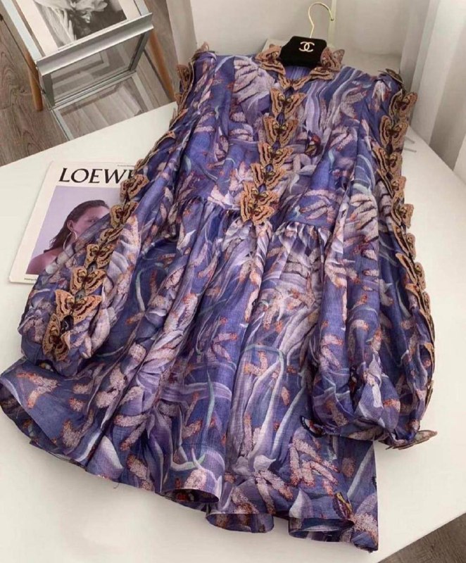 Платье Zimmermann LUX-51108 – это элегантное изделие, выполненное в богемном стиле, характерном для бренда Zimmermann. Его многослойный крой и эффектный принт с изображением тропических листьев в синих и фиолетовых тонах создают воздушный и романтичный образ. Оригинальное кружевное жабо по краю воротника и вдоль застежки придает платью изысканность и делает его уникальным.