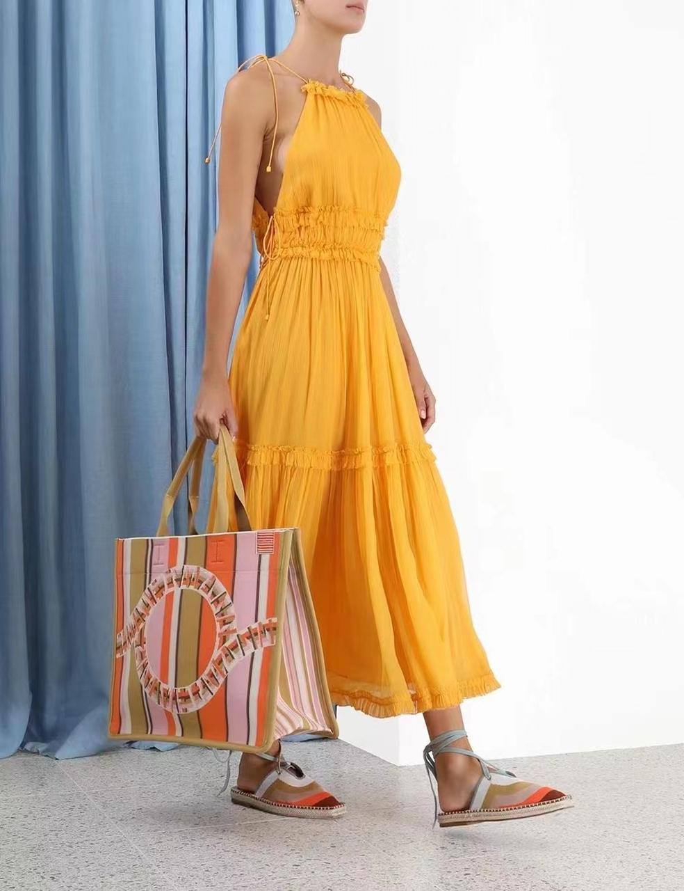 Элегантный сарафан Zimmermann LUX-53145 выполнен в ярком желтом цвете, с акцентом на детали: рюши по горловине и лифу, сборка на талии и многоярусная юбка. Этот женственный образ идеально подходит для летних прогулок, пляжного отдыха или вечерних мероприятий.