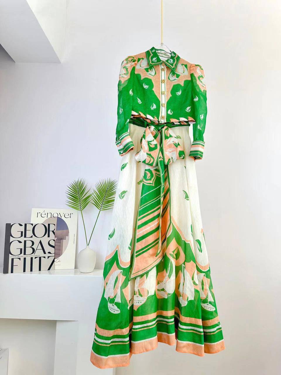Костюм женский Zimmermann LUX-91086 представляет собой изысканный ансамбль в ярких тонах, сочетающий в себе элегантность и комфорт. Костюм состоит из рубашки с длинными рукавами и пышными плечами, а также длинной юбки. Принт с изображением парусников добавляет образу летнюю свежесть и оригинальность.