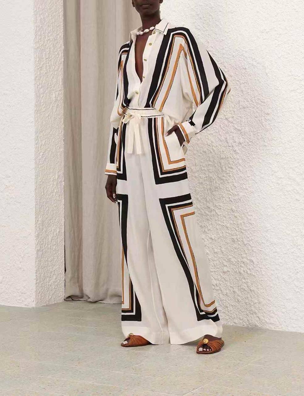 Костюм женский Zimmermann LUX-114082 — это стильный комплект в повседневном стиле. Он состоит из рубашки с длинными рукавами и брюк. Костюм выполнен в кремовом цвете с геометрическими контрастными вставками черного и охристого цветов.