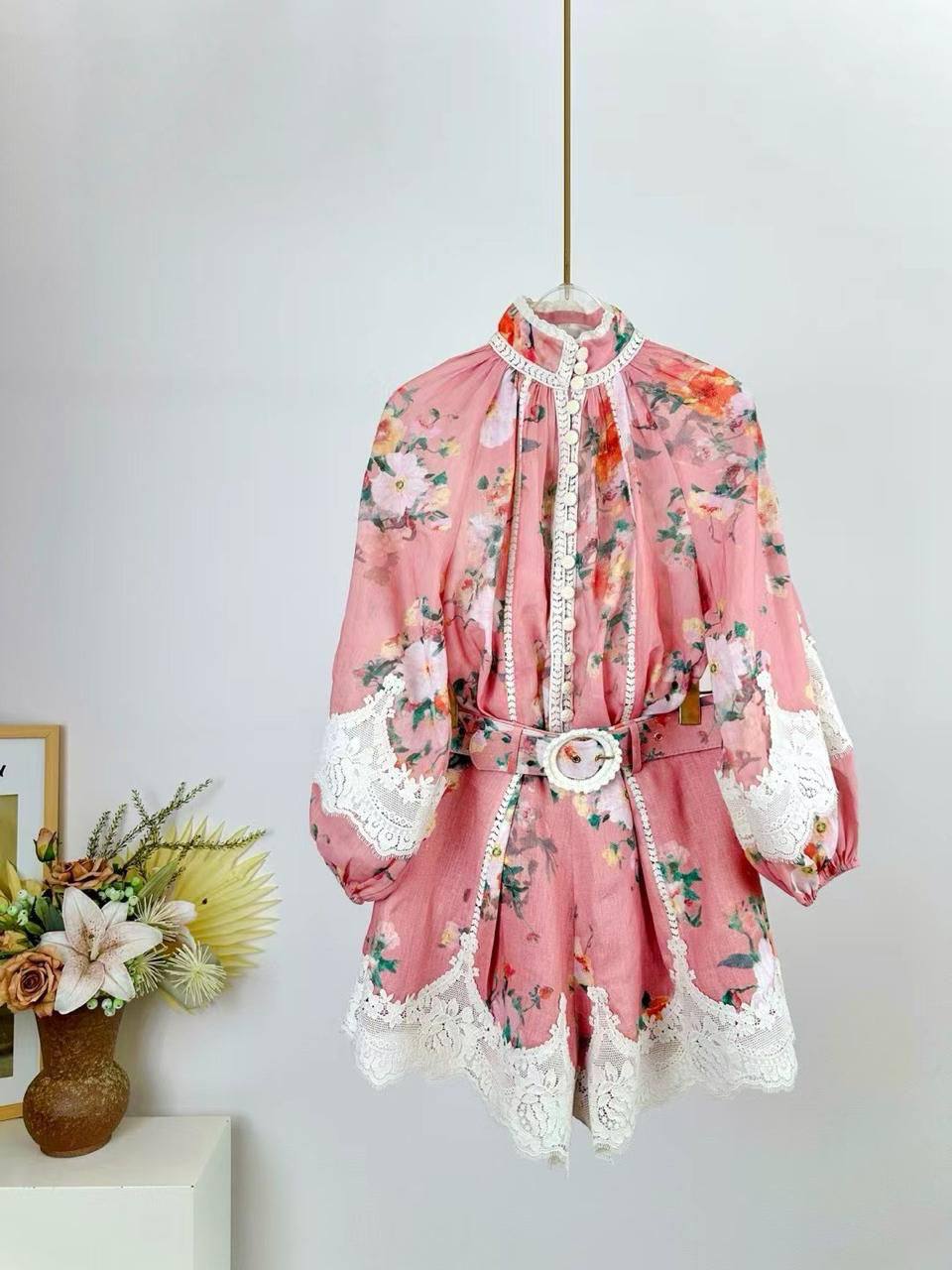 Костюм женский Zimmermann LUX-116475 представляет собой яркий образец женственности и элегантности. Он выполнен в романтичном стиле, с нежным цветочным принтом на розовом фоне. Костюм состоит из рубашки с высоким воротником и шорт с кружевной отделкой, дополненных поясом.