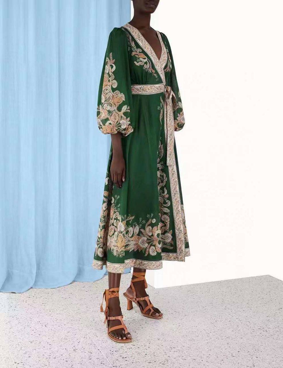 Платье Zimmermann LUX-90800 представляет собой стильное платье-халат зеленого цвета с узором. Дизайн дополнен поясом, который подчеркивает талию, и длинными рукавами с широкими манжетами. Это платье идеально подходит для создания элегантного и комфортного образа.