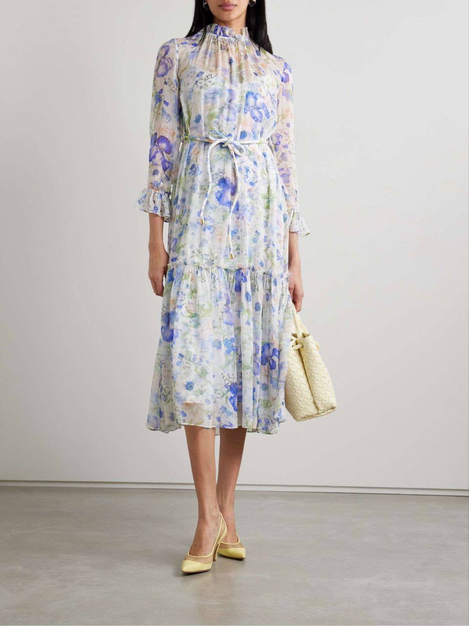 Платье Zimmermann LUX-107489 представляет собой легкое и воздушное платье миди с цветочным принтом. Оно выполнено в романтичном стиле с длинными рукавами и расклешенным подолом. Платье украшено поясом на талии, подчеркивающим силуэт.