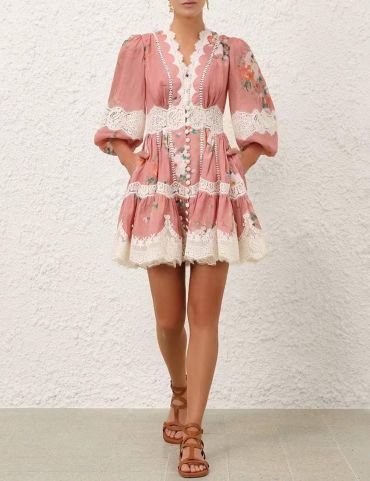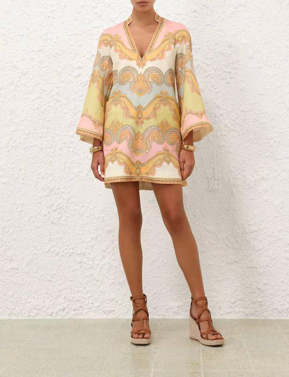 Платье Zimmermann LUX-116478 — это изысканное мини-платье с характерным узором. Оно выполнено в ярких оттенках розового, желтого и белого с замысловатым рисунком. Платье имеет свободный крой с расклешенными рукавами, что делает его идеальным для создания летних образов.