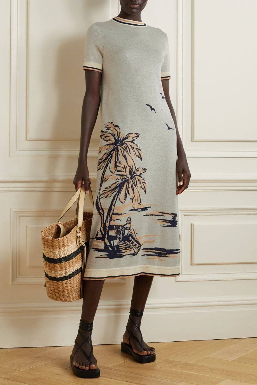 Платье Zimmermann LUX-63109 — это вязаное трикотажное платье с короткими рукавами и круглым вырезом. Оно украшено принтом с изображением пальм, моря и сидящего человека, что создает атмосферу летнего отдыха. По краю горловины и подола проходит контрастная полоса.