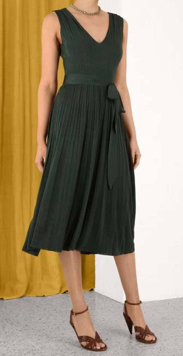 Платье Zimmermann LUX-63617 — это элегантное и женственное платье, идеально подходящее для создания изысканных образов. Оно выполнено в темно-зеленом цвете и отличается глубоким V-образным вырезом, поясом с бантом на талии и плиссированной юбкой миди. Этот наряд идеально подчеркивает фигуру, придавая образу утонченность и романтичность.
